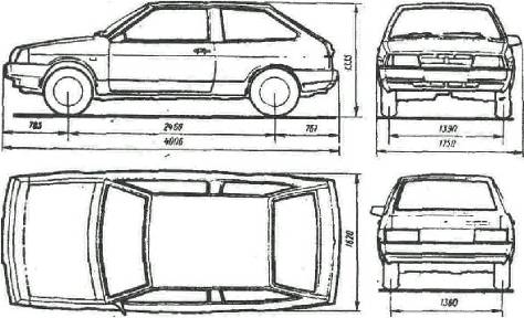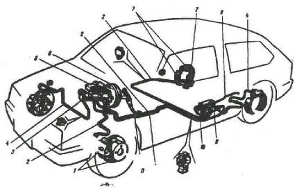 Рис. 1. Розміри ВАЗ-2108. Висота відповідає спорядженій масі автомобіля З 1984 р. на Волзькому автомобільному заводі розпочався поступовий перехід від випуску «Жигулів» різних моделей до випуску автомобілів другого покоління, першою і базовою моделлю якого є ВАЗ 2108 («Лада-Спутник-1300»). Це цілком новий автомобіль, не зв'язаний спадкоємністю за конструкцією і технологією виготовлення з «Жигулями» (рис. 1). Автомобіль ВАЗ-2108 має передньопривідне компонування. Двигун розташований попереду поперек автомобіля й об'єднаний в один агрегат зі зчепленням, коробкою передач і головною передачею, від якої крутящий момент передається до передніх коліс через шарніри рівних кутових швидкостей. Таке компоновочне рішення в сполученні з оригінальною формою кузова дозволило в порівнянні з автомобілями класичного компонування (двигун – попереду, ведучі колеса – задні) за інших рівних умов одержати незначну власну масу автомобіля, великий корисний об'єм салону, низький рівень шуму і вібрації та у цілому підвищена комфортабельність автомобіля. Застосування удосконаленого карбюратора з додатковими системами дозволило підвищити економічність двигуна і зменшити в порівнянні з попередніми моделями токсичність відпрацьованих газів. Конструкція і виконання автомобіля ВАЗ-2108 і його вузлів відповідають вимогам безпеки ЄЕК 00Н (Європейської економічної. комісії Організації Об'єднаних Націй). Внутрішнє устаткування кузова і кермової колонки значно знижують імовірність травмування водія і пасажирів при ударах. Зовнішня форма автомобіля без гострих виступаючих елементів, енергопоглинаючі бампери, двоконтурна гальмова система в сполученні з регулятором тиску задніх гальм, – усе це відповідає сучасним вимогам безпеки, запропонованим до конструкції легкових автомобілів. 1. Будова і принцип дії 1.1 Загальна будова гальмівної системиАвтомобіль обладнаний робочою і стояночною гальмовими системами. Робоча гальмова система складається з чотирьох гальмових механізмів і гідравлічного приводу, що має діагональний розділ контурів (рис. 2). Один контур гідроприводу забезпечує роботу правого переднього і лівого заднього гальмового механізмів, іншій – лівого переднього і правого заднього. Це значно підвищує безпеки водіння автомобіля.