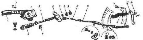 Рис. 9. Колісний циліндр З припиненням гальмування поршня зусиллям стяжних пружин зрушуються до упора сухарів у буртик упірного кільця. Так підтримується оптимальний зазор між колодками і барабаном. У поршні запресовані упори 1 колодок, а в циліндр увернутий штуцер 11 для прокачування гальма. 1.7 Стояночне гальмоМає механічний привід, діє на гальмові механізми задніх коліс. Він складається з важеля 1 (рис. 10), регулювальної тяги 5, зрівнювача 6, троса 10, важеля 13 ручного приводу колодок і розжимної планки 15. Відповідні деталі (10–14) встановлені в приводі гальма правого колеса.