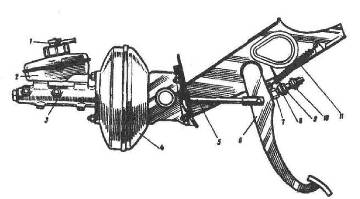 Рис. 11. Педаль гальма з вакуумним підсилювачем і головним циліндром: 1 – датчик аварійного рівня рідини; 2 – бачок; 3 – головний циліндр; 4 – вакуумний підсилювач; 5 – штовхальник; 6 – педаль гальма; 7 – буфер вимикача стоп-сигналу; 8,9 – гайки кріплення стоп-сигналу; 10 – вимикач стоп-сигналу; 11 – поворотна пружина педалі Якщо переміщенням вимикача стоп-сигналу не вдасться усунути неповне розгальмовування гальмових механізмів, то від'єднують від вакуумного підсилювача головний циліндр приводу гальм і перевіряють виступання регулювального гвинта 4 щодо площини кріплення фланця головного циліндра (розмір 1,25–0,2 мм). Цей розмір установлюють, притримуючи спеціальним ключем кінець штока, а іншим ключем завертаючи або відвертаючи гвинт 4. 2.5 Регулювання стояночного гальма Якщо стояночне гальмо не утримує автомобіль на схилі 25% при переміщенні важеля на 4–5 зубців храпового пристрою, регулюють його в наступному порядку: піднімають важіль стояночного гальма на 1–2 зуба сектора; послабляють контргайку 9 (див. рис. 10) натяжного пристрою і, загортаючи регулювальну гайку 8, натягають трос; перевіряють повний хід важеля стояночного гальма, що повинний відповідати 4–5 щигликам собачки об сектор; потім затягують контргайку. Виконавши декілька гальмувань, переконуються, що хід важеля не змінився, а колеса автомобіля обертаються вільно, без захватування при нижньому положенні важеля. 2.6 Перевірка працездатності регулятора тиску на автомобілі Встановлюють автомобіль на підйомник або оглядову канаву, очищають регулятор тиску і деталі його приводу від бруду. Зовнішнім оглядом переконуються, що регулятор тиску і деталі його приводу не мають ушкоджень, відсутнє підтікання гальмової рідини, заглушка 24 (див. рис. 5) утоплена в отвір корпуса на 1–2 мм, відсутній люфт у з'єднанні сережки 11 (див. рис. 4) із пружним важелем 10 і пальцем 15 кронштейну. Просять помічника натиснути на педаль гальма. Поршень 2 (див. рис. 5) при цьому повинний висуватися з корпуса на 1,6–2,4 мм, віджимаючи пружину 7 (див. рис. 4) до упора її у важіль 5. Останній, долаючи зусилля з боку пружного важеля 10, повернеться щодо вісі 4. Невідповідність перерахованим вимогам, відсутність ходу поршня, а також його недостатній або надмірний хід свідчать про несправність регулятора або його приводу. У цьому випадку ремонтують або заміняють регулятор тиску, а після його установки регулюють привід. 2.7 Видалення повітря з гідропривода Прокачування гальм необхідне для видалення повітря з гідропривода, що значно знижує ефективність робочої гальмової системи. Повітря може потрапити в гідропривід унаслідок розгерметизації системи при ремонті або заміні окремих вузлів, а також при заміні гальмової рідини. На наявність повітря в приводі гальма вказують збільшений хід педалі гальма і її «м'якість». Перед видаленням повітря з гальмової системи переконуються в герметичності усіх вузлів приводу гальм і їхніх з'єднань, очищають кришку і поверхню навколо кришки бачка, заповнюють бачок рідиною «Нева» або «Томб» до мітки «МАХ». Потім ретельно очищають штуцера для видалення повітря і знімають з них захисні ковпачки. Не рекомендується застосовувати рідину, злиту із системи для заповнення бачка, тому що вона насичена повітрям, має багато вологи і, можливо, забруднена.