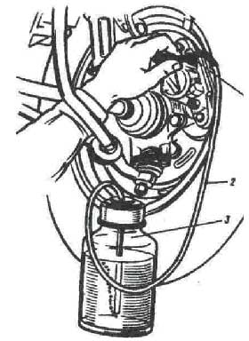 Рис. 12. Видалення повітря з гідропривода гальм Повітря із системи видаляють спочатку з одного контуру, потім з іншого, починаючи з колісних циліндрів задніх гальм. Надівають на голівку штуцера 1 (рис. 12) гумовий шланг 2 для зливу рідини, а його вільний кінець опускають у прозору судину З, частково заповнену рідиною. Різко натиснувши на педаль гальма 3–5 разів з інтервалами 2–3 с, відвертають на 1/2–3/4 обороти штуцер при натиснутій педалі. Продовжуючи натискати на педаль, витискають рідину, що знаходиться в системі, разом із повітрям через шланг у судину. Після того, як педаль гальма досягне переднього крайнього положення і витікання рідини через шланг припиниться, завертають штуцер випуску повітря до упору. Повторюють ці операції доти, поки не припиниться вихід пухирців із шланга. Утримуючи педаль у натиснутому положенні, завертають штуцер до упору і знімають шланг. Протирають насухо штуцер і надівають захисний ковпачок. Потім повторюють операції для інших коліс, спочатку на другому колесі цього ж контуру, а потім послідовно на обох колесах іншого контуру. При видаленні повітря стежать за наявністю рідини в бачку, не допускаючи оголення його дна, тому що при цьому в систему знову потрапляє повітря. При відсутності в приводі гальма повітря педаль гальма повинна проходити біля 1/2 своєї повної ходи. Щоб виключити вплив вакуумного підсилювача на прокачування гальм, видалення повітря проводять при непрацюючому двигуні. Якщо в гідравлічному приводі відсутня гальмова рідина, то заповнюють систему в такий спосіб: заливають у бачок гальмову рідину; відвертають на 1,5–2 обороти штуцера на циліндрах коліс; різко натискаючи на педаль гальма і плавно відпускаючи її, завертають штуцера в міру витікання з них рідини. Потім прокачують тормозну систему. При видаленні повітря на автомобілі, тормозна система якого проробила тривалий термін, рідину замінюють новою. 2.8 Заміна гальмової рідини Для того щоб у систему гідропривода не потрапило повітря і витрачалася мінімальна кількість часу на цю операцію, притримуються наступних правил: діють у тому ж порядку, як і при прокачуванні гальма, але використовують шланг із скляною трубкою на кінці, що опускають у судину з гальмовою рідиною; натискаючи на педаль гальма, викачують стару гальмову рідину доти, поки в трубці не покажеться нова; після цього роблять два повних ходи педаллю гальма і, утримуючи її в натиснутому положенні, завертають штуцер. При прокачуванні стежать за рівнем рідини в бачку і доливають рідину до максимального рівня; повторюють таку ж операцію на кожному робочому циліндрі в тому ж порядку, як і при прокачуванні; наповнюють бачок до максимального рівня і перевіряють роботу гальм на ходу автомобіля. 2.9 Вакуумний підсилювач При знятті підсилювача головний циліндр гідропривода гальм не від'єднується від гідросистеми, щоб до неї не потрапило повітря. Від'єднують штовхальник вакуумного підсилювача від педалі, відвертають гайки кріплення головного циліндра до підсилювача, знімають його зі шпильок і відводять убік, обережно вигинаючи трубопроводи, щоб не пошкодити їх. Від'єднують від підсилювача шланг, відвертають гайки кріплення кронштейну вакуумного підсилювача до підсилювача кронштейну і знімають вакуумний підсилювач у зборі з кронштейном. Потім від'єднують підсилювач від крон