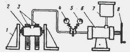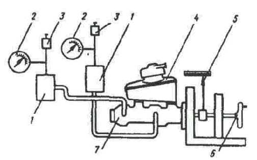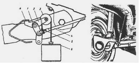 Рис. 13. Схема перевірки герметичності головного циліндра Встановлюють головний циліндр на стенд БС-134.000 і під'єднують його до елементів стенда, як зазначено на рис. 13. Заповнюють бачок 4 циліндра гальмовою рідиною і, переміщуючи декілька разів поршні головного циліндра 7 на повну довжину їхнього ходу, прокачують систему через клапани 3. Обертаючи маховик б, повільно пересувають поршні головного циліндра доти, поки тиск, контрольований манометрами 2, не досягне 125 кгс/см2. У цьому положенні, що фіксується покажчиком 5, блокують штовхальник головного циліндра. Зазначений тиск повинний залишатися постійним не менше 5 с. У випадку відходу рідини або зміни тиску протягом цього часу заміняють ущільнюючі уільця поршнів. Для забезпечення точності показань манометрів 2 стенд оснащується поглинаючими циліндрами. 2.14 Зняття й установка регулятора тиску Від'єднують пружний важіль 10 (див. рис. 4) приводу регулятора тиску від важеля задньої підвіски, для чого знімають із пальця 15 стопорне кільце 14, шайбу 13, а потім сережку 11. Від'єднують від регулятора тиску трубопроводи, не допускаючи витікання гальмової рідини. При від'єднанні трубопроводів звертають увагу на їхнє положення, щоб при встановленні приєднати їх до тих самих гнізд. Переплутування трубопроводів неприпустимо. Відвертають гайки кріплення кронштейну 9 регулятора тиску до кронштейну 8 кузова і знімають кронштейн у зборі з регулятором тиску і важелями його приводу. Установка регулятора тиску проводиться в зворотному порядку. 2.15 Перевірка і регулювання приводу регулятора тиску Встановіть автомобіль на підйомник або оглядову канаву. Автомобіль повинний стояти на колесах, бути в спорядженому стані. Бак повинний бути заправлений приблизно наполовину. Якщо палива буде менше половини, то відсутню частину палива компенсуйте вантажами, розташувавши Їх у багажнику. Протисніть задню частину автомобіля, прикладаючи 2–3 рази зусилля 40–50 кгс, спрямоване зверху вниз на задній бампер автомобіля, для установки задньої підвіски в середнє положення. Встановіть між важелями задньої підвіски І кузовом штанги з баранчиками (рис. 14 – справа) для фіксації його в даному положенні. Попередню оцінку настроювання приводу регулятора тиску можна визначити по зазору між нижньою частиною важеля 5 (див. рис. 4) приводу регулятора тиску і пружиною 7. Зазор повинний бути в межах 2,0–2,1 мм.