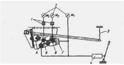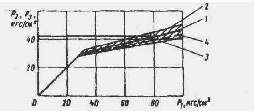 Рис. 15. Діаграма перевірки працездатності регулятора тиску: Р1 – тиск на входах А і Г (див. рис. 16) регулятора тиску; Р2 – тиск на виході Б; РЗ – тиск на виході В; 1 – номінальний тиск Р2: 2 – верхня межа тиску Р2; 3 нижня межа тиску Р2; 4 – тиск РЗ Якщо була загублена заглушка 24, установлюють нову так, щоб вона заглибилась в корпус регулятора на 1–2 мм. При складанні всі деталі змащують гальмовою рідиною. 2.17 Перевірка регулятора тиску на стенді Встановлюють регулятор тиску на стенд і підключають його, як показано на рис, 16. Закріплюють кінець пружного важеля в навантажувальному приладі 3. Прокачують систему через клапани 1. Перевіряють герметичність приєднання регулятора до стенда (витікання не допускаються). Регулюють натяг пружного важеля навантажувальним пристосуванням: точка вмикання повинна бути (30+1) кгс/см2. Для визначення точки вмикання використовують манометри 2 (МІ і М2).