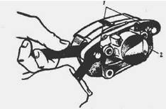 Рис. 17. Відвертування болта кріплення циліндрів Від'єднують шланг від колісного циліндра 2 (рис. 17). Розконтрують і відвертають болти 1 кріплення колісного циліндра до направляючих пальців, притримуючи ключем за грані направляючий палець, щоб не ушкодити захисний чохол. Знімають направляючу 8 (рис. 18) колодку у зборі з пальцями. Знімають гальмові колодки 9. Не рекомендується відвертати болти 14, що з'єднують між собою супорт і циліндр, крім випадків заміни супорта або циліндра.
