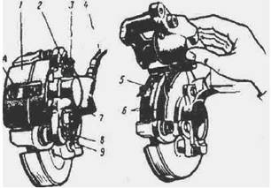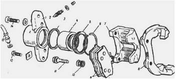Рис. 18. Деталі гальмового механізму переднього колеса Знімають стопорне кільце 6 (див. рис. 18) і захисний ковпачок 5 Із циліндра і поршня. Акуратно, нагнітаючи струмінь стиснутого повітря через отвір для шланга 13, виштовхують поршень 4 із циліндра 1. Щоб при виштовхуванні не пошкодити поршень об поверхню супорта 7, установлюють під поршень дерев'яну накладку. Відвертають із корпуса циліндра штуцер 2 для прокачування й уважно оглядають робочу поверхню циліндра. На ній не повинне бути задирів, ушкоджень і корозії. Складання гальмового механізму проводять у зворотній послідовності. При цьому ущільнююче кільце 3 і ковпачок 5 рекомендується заміняти новими. Дзеркало циліндра, поршень і ущільнююче кільце змащують гальмовою рідиною, а на поверхню поршня наносять графітове мастило, установлюють поршень в циліндр і, не видаляючи залишки мастила, надівають захисний ковпачок 5 так, щоб його края ввійшли в канавки поршня і циліндра, після чого встановлюють стопорне кільце 6. Направляючі пальці 11 змащують мастилом Уніол-1. Болти 12 кріплення супорта і циліндра до пальців затягують моментами, після чого контрять Їх. Перед загортанням болтів наносять на них герметик, щоб не корелювала різьбова частина з'єднання. Після складання й установки гальмового механізму відновлюють рівень рідини в бачку і прокачують гідропривід. 2.20 Перевірка технічного стану Очищають усі деталі й увалено перевіряють їхній стан: чи немає ознак зносу, ушкоджень або корозії. Особливу увагу звертають на поверхню поршня і циліндра. При їхньому зносі, ушкодженні або сильному кородуванні заміняють циліндр і поршень. З корпуса циліндра корозію видаляють дротяною щіткою. Перевіряють направляючі пальці 11 (див. рис. 18) і їхні ущільнюючі чохли 10. Переконуються, що на пальцях немає корозії й ушкоджень, що вони не заїдають в отворах направляючої. Пальці повинні переміщатися вільно. У випадку їхньої корозії й ушкоджень заміняють пальці й захисні чохли новими. Перевіряють стан гальмового диска. На його робочій поверхні не допускаються задирання і глибокі риски, а також інші пошкодження, від яких збільшується знос накладок або зменшується ефективність гальмування. Перевіряють товщину диска, що повинна бути не менше 10,8 мм. Якщо товщина менше зазначеної, заміняють диск. Допускається проточити або прошліфувати диски, але при цьому обидві сторони повинні оброблятися на однакову глибину, а товщина диска не повинна бути в результаті менше 10,8 мм. Гальмові колодки заміняють новими при поломці піджимних пружин, при зносі накладок до товщини 1,5 мм. Колодки заміняють новими одночасно на обох гальмових механізмах, тобто обидві пари. 2.21 Перевірка биття гальмового диска Перевіряють биття робочої поверхні вісі гальмового диска, не знімаючи його з автомобіля. Найбільш припустиме биття по індикаторі 0,15 мм. Якщо биття більше, диск заміняють або шліфують, але остаточна товщина диска повинна бути не менше 10,8 мм. 2.22 Заміна гальмових колодок При необхідності заміни гальмових колодок відгинають кут стопорної шайби 9 (рис. 19) з грані нижнього болта 8, відвертають його, притримуючи ключем за грані направляючий палець.