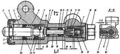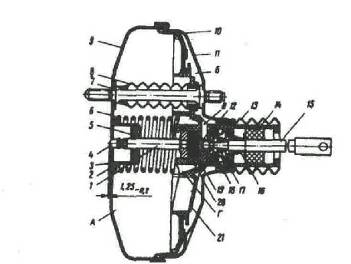 Рис. 3. Вакуумний підсилювач: 1 – шток; 2 – ущільньнююче кільце головного циліндра; 3 – чашка корпуса підсилювача; 4 – регулювальний гвинт; 5 – ущільнювач штока; 6 – поворотна пружина діафрагми; 7 – шпилька підсилювача; 8 – ущільнюючий чохол; 9 – корпус підсилювача; 10 – діафрагма; 11 – кришка корпуса підсилювача; 12 – поршень; 13 – захисний чохол корпуса клапана; 14 – повітряний фільтр; 15 – штовхальник; 16 – поворотна пружина штовхальника; 17 – пружина клапана; 18 – клапан; 19 – втулка корпуса клапана; 20 – буфер штока; 21 – корпус клапана; А – вакуумна камера; Б – атмосферна камера; В, Г – канали Гумова діафрагма 10 (рис. 3) разом із корпусом 21 клапана поділяють порожнину вакуумного підсилювача на дві камери: вакуумну А і атмосферну Б. Камера А з'єднується з впускною трубою двигуна. Корпус 21 клапана пластмасовий. На виході з кришки він ущільнюється гофрованим захисним чохлом 13. У корпусі клапана розміщений шток 1 приводу головного циліндра з опорною втулкою, буфер 20 штока, поршень 12 корпуса клапана, клапан 18 у зборі, поворотні пружини 16 і 17 штовхальника і клапана, повітряний фільтр 14, штовхальник 15. При натисканні на педаль переміщається штовхальник 15, поршень 12 і корпус 21 клапана, а слідом за ними і клапан 18 до упора в сідло корпуса клапана. При цьому камери А і Б роз'єднуються. При подальшому переміщенні поршня його сідло відходить від клапана і через зазор, що утворився, камера Б з'єднується з атмосферою. Повітря, що надійшло через фільтр 14, зазор між поршнем і клапаном та канал В, давить на діафрагму 10. За рахунок різниці тиску в камерах А і Б корпус клапана переміщається разом із штоком 1, що діє на поршень головного циліндра. При відпущеній педалі клапан відходить від свого корпуса і через зазор, що утворився, і канали В і Г камери А і Б сполучаються між собою. 1.3 Регулятор тискуЦей пристрій регулює тиск у гідравлічному приводі гальмових механізмів задніх коліс у залежності від навантаження на задню вісь автомобіля (рис. 4). Він включений в обидва контури гальмової системи, і через нього гальмова рідина надходить до обох заднім гальмових механізмів.