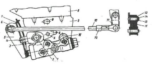 Рис. 4. Привід регулятора тиску Регулятор тиску 1 кріпиться до кронштейну 9 двома болтами 2 і 16. При цьому передній болт 2 одночасно кріпить вільчатий кронштейн З важеля 5 приводу регулятора тиску. На пальці цього важеля шарнірно штифтом 4 кріпиться двоплечий важіль 5. Його верхнє плече через вісь 6 зв'язане з пружним важелем 10, інший кінець якого через сережку 11 шарнірно з'єднується з кронштейном важеля задньої підвіски. Кронштейн 3 разом із важелем 5 за рахунок овальних отворів під болт кріплення можна переміщати щодо регулятора тиску. Цим самим регулюється зусилля, з котрим важіль 5 діє на поршень регулятора. У регуляторі є чотири камери: А і Г (рис. 5) з'єднуються з головним циліндром, Б – із правим, а В-з лівим колісними циліндрами задніх гальм. У вихідному положенні педалі гальма поршень 2 затиснутий важелем 5 (див. рис. 4) через пластинчасту пружину 7 до штовхальника 20 (див. рис. 5), що під цим зусиллям прижимається до сідла 14 клапана 18. При цьому клапан 18 віджимається від сідла й утворюється зазор Й, а також зазор К між голівкою поршня й ущільнювачем 21. Через ці зазори камери А і Г сполучаються з камерами Б і В.