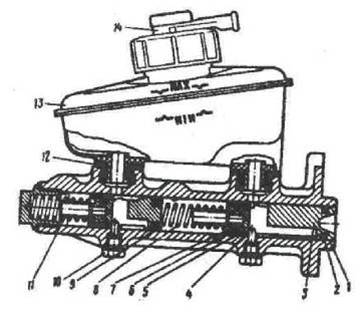 Рис. 5. Регулятор тиску При натисканні на педаль гальма рідина через зазори К і И і камери Г і В надходить у колісні циліндри гальмових механізмів. При збільшенні тиски рідини зростає зусилля на поршні, що намагається висунути його з корпуса. Коли зусилля від тиску перевищить зусилля від пружного важеля, поршень починає висуватися з корпуса, а слідом за ним переміщається під дією пружин 12 і 17 штовхальник 20 разом із втулкою 19 і кільцями 10. При цьому зазор Ж збільшується, а зазори И і К зменшуються. Коли зазор И вибереться цілком і клапан 18 ізолює камеру Г від камери В, штовхальник 20 разом із розташованими на ньому деталями перестає переміщатися слідом за поршнем. Тепер тиск у камері В буде змінюватися в залежності від тиску в камері Б. При подальшому збільшенні зусилля на педалі гальма тиск у камерах Г, Б і А зростає, поршень 2 продовжує висуватися з корпуса, а втулка 19 разом з ущільнюючими кільцями 10 і тарілкою 11 під посилюючим тиском у камері Б зрушується вбік пробки 16. При цьому зазор Ж починає зменшуватися. За рахунок зменшення об'єму камери В тиск у ній, а значить і в приводі гальма, наростає і приктично буде дорівнювати тиску в камері Б. Коли зазор ДО цілком вибереться, тиск у камері Б, а значить і в камері В, буде зростати в меншому ступені, ніж тиск у камері А за рахунок дроселювання рідини між голівкою поршня й ущільнювачем 21. Залежність між тиском у камерах Б і А визначається відношенням різниці площ голівки і штока поршня до площі голівки. У корпусі регулятора виконаний отвір, що закривається заглушкою 24. Потік рідини з-під заглушки при її витисканні свідчить про негерметичність кілець 10. 1.4 Головний циліндрНа корпусі головного циліндра кріпиться бачок 13 (рис. 6), у заливній горловині якого встановлений датчик 14 аварійного рівня гальмової рідини. Ущільнюючі кільця 5 високого тиску використовуються з заднього колісного циліндра.