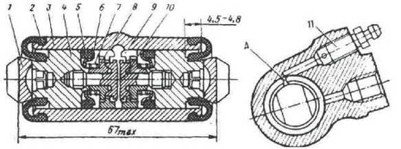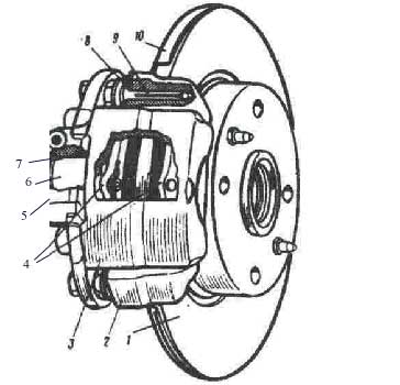 Рис. 7. Гальмовий механізм переднього колеса Дисковий, з автоматичним регулюванням зазора між колодками і диском, із плаваючою скобою. Скоба утворюється супортом 3 (рис. 7) і колісним циліндром 5, що стягнуті болтами. Рухлива скоба кріпиться болтами до направляючих пальців 9, що встановлені в отвори направляючої 2 колодки. У ці отвори закладається мастило. Між пальцями і направляючою колодок встановлені гумові чохли 8. До пазів направляючої піджаті пружинами гальмові колодки 4. У порожнині колісного циліндра встановлений поршень 6 зущільнюючим кільцем 7. За рахунок пружності цього кільця підтримується оптимальний зазор між колодками і диском 1, поверхня якого захищена кожухом 10. При гальмуванні під тиском рідини поршень 6 притискає внутрішню колодку до диска, після чого від сили реакції переміщається на пальцях 9 рухлива скоба і зовнішня колодка теж притискається до диска. При цьому сила притискання колодок буде однакової. При розгальмуванні за рахунок пружності ущільнюючого кільця 7 поршень відводиться від колодки і між колодками і диском утворюється невеликий зазор. 1.6 Гальмовий механізм заднього колесаБарабанний, з автоматичним регулюванням зазора між колодками і барабаном (рис. 8). Пристрій автоматичного регулювання зазора розташований в колісному циліндрі 3 (рис. 9). Його основним елементом є розрізне упірне кільце 9, установлене на поршні 4 між буртиком упорного гвинта 10 і двома сухарями 8 із зазором 1,25–1,65 мм. Упорні кільця 9 встановлені в циліндр із натягом, що забезпечує зусилля зрушення кільця по дзеркалу циліндра не менше 35 кгс, що перевищує зусилля на поршні від стяжних пружин 3 і 7 (див. рис. 8 гальмових колодок.