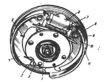Рис. 8. Гальмовий механізм заднього колеса 1 – гайка кріплення ступиці; 2 – ступиця колеса; 3 – нижня стяжна пружина колодок; 4 – гальмова колодка; 5 – направляюча пружина; 6 – колісний циліндр; 7 – верхня стяжна пружина; 8 – розжимна планка; 9 – палець важеля приводу стояночного гальма; 10 – важіль приводу стояночного гальма; 11 – гальмовий щит При зносі накладок зазор 1,25–1,65 мм усувається цілком, буртик на опірному гвинті 10 (див. рис. 9) притискається до буртика кільця 9, внаслідок чого упірне кільце під тиском гальмової рідини зрушується слід за поршнем на розмір зносу.
