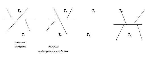 Определение станционных интервалов τн, Iпр, Iот, межпоездной интервал I на однопутном и двухпутном участках. τн - интервал неодновременного прибытия поездов противоположных направлений - минимальное время от момента прибытия на станцию однопутного участка поезда одного направления до момента прибытия на эту станцию или пропуска через неё поезда встречного направления.