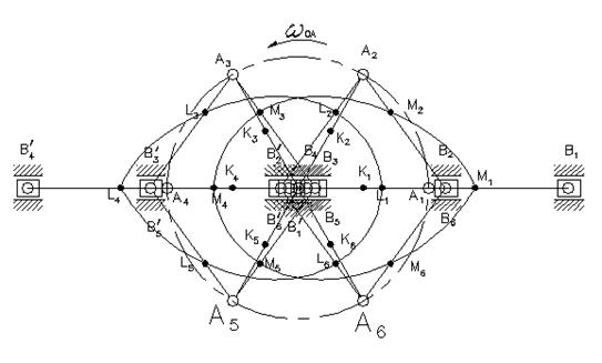 Имея графические значения линейных размеров (длин звеньев АВ и АВ'), строим план 6-ти положений механизма из одной общей точки О вращения кривошипа ОА, начиная с разбивки траектории движения точки А конца кривошипа на 6 равных частей. За 1-ое положение принято правое "мертвое" положение ползуна В. Методом засечек находятся положения всех звеньев механизма для каждого из 6-ти положений кривошипа. На плане положений показаны траектории центров тяжести звеньев АВ и АВ' – точек М и L. План положений механизма показан на рис. 6 и на чертеже курсовой работы.