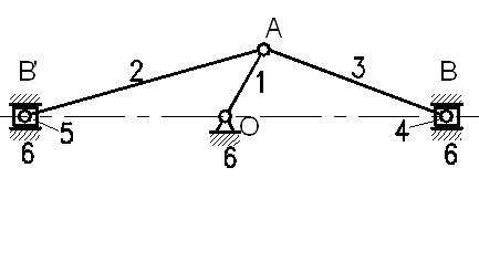 Рис. 1. Структурная схема рычажного механизма Исходные данные для расчета Размеры звеньев Масса звеньев ОА = 140 мм,mOA = 27 кг, АВ = 150 мм,mAВ = mАВ' = 20 кг, AB'= 150 мм.mВ = mВ' = 8,5 кг. Частота вращения кривошипа nOA = 350 об/мин, wOA = const. Угол расчетного положения кривошипа j = 60°. Движущая сила Рдв = 5500 Н. Сила полезного сопротивления Рс = 4200 Н. 1.2 Классификация кинематических пар по четырём признакам Кинематической парой называется подвижное соединение двух звеньев, ограничивающее их относительное движение. Кинематические пары механизма показаны на рис. 2.