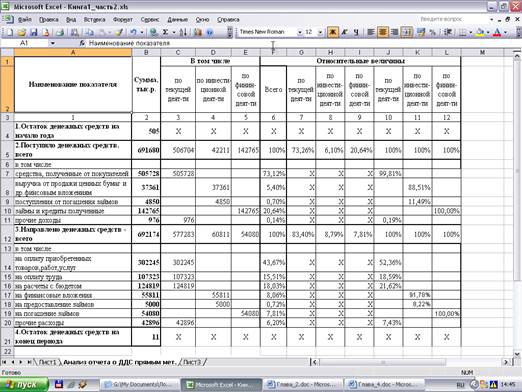 Рисунок 2.1 - Анализ отчета о ДДС прямым методом Отчет о движении денежных средств должен содержит сведения о потоках денежных средств (поступление, направление денежных средств) с учетом остатков денежных средств на начало и конец отчетного периода в разрезе текущей, инвестиционной и финансовой деятельности. Анализ отчета о движении денежных средств позволяет установить: - степень финансирования текущей и инвестиционной деятельности за счет собственных источников; - зависимость предприятия от внешних источников поступлений средств; - дивидендную политику в настоящем периоде и сделать прогноз на будущее; - финансовую эластичность, т.е. способность предприятия создавать денежные резервы (чистый приток денежных средств); - реальное состояние платежеспособности за истекший период и прогноз на следующий краткосрочный период. В колонках 8, 9, 10 таблицы 2.1 записаны показатели горизонтального анализа. Сумма поступивших денежных средств составила 506704 тыс. руб. Из них 73,26 % приходится на текущую деятельность, 6,1 % на инвестиционную деятельность и 20,64 % - финансовую. Отток денежных средств организации в отчетном периоде составил 692174 тыс. руб. Из них 83,4 % - это средства, приходящиеся на текущую деятельность, 8,79 % - по инвестиционной деятельности, 7,81 % - по финансовой. В колонках 7, 11, 12 и 13 записаны данные вертикального анализа. Из всей поступившей за отчетный период суммы денежных средств наибольший удельный вес приходится на средства, полученные от покупателей и заказчиков - 73,12 % и на поступления от погашения займов, предоставленных другим организациям - 20,64 %. В оттоке денежных средств наибольший удельный вес занимают средства, направленные на оплату приобретенных товаров, работ, услуг, сырья и иных оборотных активов - 43,67 % и расчеты с бюджетом - 18,03 %. Отрицательным моментом в движении денежных средств организации является превышение оттока средств над их притоком на 494 тыс. руб. (11 - 505). Для финансовой стабильности должно быть наоборот. Анализ показывает также, что в организации сложилась опасная ситуация, когда отток средств от текущей и инвестиционной деятельности превысил приток. По текущей деятельности чистые денежные средства, находящиеся в оттоке составляют 70579 тыс. руб., это произошло за счет того, что ОАО "Рудгормаш" большую часть своих денежные средства направило на оплату приобретенных товаров, работ и услуг. Необходимым условием финансовой стабильности является такое соотношение притоков и оттоков средств в рамках текущей деятельности, которое обеспечивает увеличение финансовых ресурсов, достаточное для осуществления инвестиций. По инвестиционной деятельности чистые денежные средства, находящиеся в оттоке составили 18600 тыс. руб., это произошло за счет приобретения ценных бумаг и иных финансовых вложений. В перспективе это может оказать положительное влияние. Главным недостатком прямого метода анализа движения денежных средств является то, что он не раскрывает взаимосвязи полученного финансового результата и изменения денежных средств на счетах организации. Величина притока денежных средств существенным образом отличается от суммы полученной прибыли. Как следует из формы № 2 "Отчет о прибылях и убытках" (приложение № 2), анализируемая организация получила прибыль 29612 тыс. руб., а прибыль за вычетом всех налогов и обязате