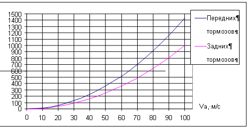 3.4 График оптимального распределения тормозных сил по осям При оптимальном соотношении тормозных сил на колесах передней и задней осей автомобиля тормозной путь – минимальный. Соотношение тормозных сил, близкое к оптимальному, обеспечивается регулятором. Тормозные силы на осях определяются по формулам: