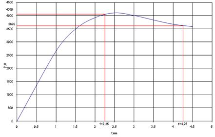 На основании данной формулы построен график зависимости прижимного усилия от деформации пружин рисунок 3; На графике значению PΣ = 3692 Н соответствует прогиб 0,00425 м. При износе накладки на 1 мм прогиб будет 0,00225 м. Этому значению соответствует PΣ = 4060Н.