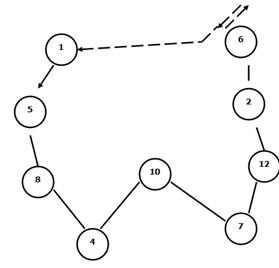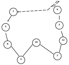 Начальный маршрут 1-8-12. В начальном маршруте определяем место для пункта 7: ∆L1-8 = ∆L1-7 + ∆L7-8 - ∆L1-8 16+8-11 = 13 ∆L8-12 = 8+3-10 = 1 Следовательно, место пункта 7 на участке 8-12 и маршрут составит цепочку: 1-8-7-12 Выбираем место в цепочке пункту 4 ∆L1-8 = 14+3-11 = 6 ∆L8-7 = 3+5-8 = 0 Пункт 4 будет на участке 8-7, т.к. приращение маршрута равно 0 и маршрут составит цепочку: 1-8-4-7-12 Определяем место в цепочке для пункта 10: ∆L1-8 = 13+7-11 = 9 ∆L8-4 = 7+4-3 = 8 ∆L4-7 = 4+3-5 = 2 ∆L7-12 = 3+4-3 = 4 Пункт 10 будет на участке 4-7 и маршрут составит цепочку: 1-8-4-10-7-12 Протяженность маршрута мусоровоза составит: 11+3+4+3+3=24 (км) По полученной цепочке составим новый маршрут по 1-му микрорайону. Маршрут движения мусоровоза по 1-ой группе микрорайонов