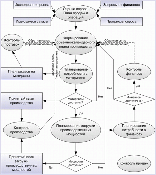 Функция планирования потребности и загрузки мощностей. Данная функция позволяет представить картину загрузки рабочих центров согласно той производственной программе, которая принята на уровне объемно-календарного плана и прошла через расчет потребности в изготавливаемых компонентах. Таким образом, на цеховой уровень передается для исполнения реалистичный план, за исполнение которого люди будут нести ответственность. Модуль позволяет прогнозировать возможные проблемы с мощностями и вовремя их разрешать, т.е. избежать столкновения с ними тогда, когда изменения календарного плана невозможны или дорогостоящи. Отметим, что функция не пытается решить выявленные проблемы, а оставляет их на усмотрение людей. Потребность в мощностях калькулируется на основании как плановых, так и запущенных в производство (открытых) заказов. Плановые заказы поступают из функций формирования главного объемно-календарного плана и планирования потребности в материалах, а открытые извлекаются из функций планирования и диспетчирование на уровне цеха. План продаж и операций (или план продаж и производства) служит двум основным целям в рамках функционирующей системы ERP. Первая цель – быть ключевым связующим звеном между процессом стратегического и бизнес планирования и системой детального планирования и исполнения плана компании. Связь эта налаживается между бизнес-планом предприятия (и, в частности, его финансовой частью) и главным календарным планом производства. Необходимо обеспечить механизм согласования планов высокого уровня и доведения их до функциональных подразделений предприятия: · Отдела сбыта; · Финансовых служб; · Технологических отделов; · Производственных подразделений; · Отделов снабжения и других отделов. Эффективно поставленный процесс планирования продаж и операций позволяет усовершенствовать контроль над деятельностью предприятия. Вторая цель заключается в том, что принятый план продаж и операций является регулятором всех остальных планов и графиков. По сути, это бюджет, который устанавливается топ-менеджментом для главного календарного плана производства, в свою очередь, формирующего все последующие по иерархии календарные планы. Полученный в результате процесса планирования с участием всех заинтересованных лиц план продаж и операций может и не быть оптимальным с точки зрения отдельных руководителей функциональных подразделений, однако он призван сбалансировать потребности сбыта и маркетинга с возможностями производства. И наоборот, план производства может быть разработан для поддержки и долгосрочного плана продаж и целей, устанавливаемых предприятием в области управления запасами и задолженностью по поставкам перед покупателями. Говорят, что в долгосрочной перспективе управлять производством должны потребности рынка, и производство должно соответствовать им. В краткосрочной же перспективе ограничения по производственной мощности могут задавать темп производства. Управление спросом связывает следующие функции предприятия: прогнозирование спроса, работа с заказами покупателей, дистрибуция, движение материалов и сборочных единиц между производственными площадками компании. Таким образом, управление спросом является неотъемлемой частью процесса укрупненного планирования и разработки 