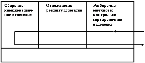Рис. 2.8.1. Схема прямого производственного потока. 2.9Выбор подъемно-транспортных средств Внутрицеховой транспорт предназначен для подъема и перемещения всех грузов производственного процесса ремонтного предприятия как в пределах отдельного подразделения так и между ними. В качестве подъемно-транспортных средств применяются кран балки с электротельферами, подъемники и др. Тип и число единиц подъемно-транспортного оборудования принимаем исходя из поста работы подобных предприятий или по типовым проектам. По аналогии с типовым проектом над сквозным проездом в отделении ремонта машин имеются кран-балки с грузоподъёмностью 3,6 тонн, обслуживающая пролёт шириной 14 м. и с шириной пролёта 12 м. В качестве транспортных средств используются тележки для перевозки узлов, агрегатов тракторов, электрокары. 3. ПРОЕКТИРОВАНИЕ ПРОИЗВОДСТВЕННОГО ОТДЕЛЕНИЯ 3.1 Назначение Отделение по ремонту и модернизации КПП предназначено для ремонта коробок переменных передач тракторов МТЗ, их модернизации. 3.2 Обоснование технологического процесса В курсовом проекте по технологии ремонтно-обслуживающего производства изложено обоснование принятого технологического процесса. Разработанный технологический процесс позволяет выполнить работы по ремонту и модернизации коробок переменных передач трактора МТЗ – 80/82. 3.3 Производственная программа и годовой объем работ Качество и себестоимость восстановления деталей в значительной мере зависят от способа их восстановления, но и от годовой программы предприятия [5]. При оптимально выбранной программе улучшается использование оборудования, повышается производительность труда, снижается себестоимость восстановления деталей. Годовая производственная программа рассчитана для парка тракторов МТЗ – 80/82 в 10000 единиц. Годовой объем работ рассчитывается по формуле: Т=П*tц/3600, [3.1] где П- производственная программа, шт. tц- время цикла, сек. Годовой объем работ в отделении длиться на работы непосредственно связанные с восстановлением, т.е. основные работы и вспомогательные. Таблица 5. Распределение трудоёмкости по отделениям