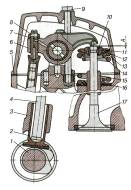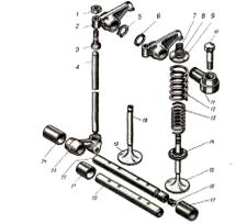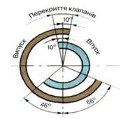 1 — контргайка; 2 — коромисло; З — регулювальний гвинт; 4 — штанга;5 — замкова шайба; б упорна шайба; 7 втулка тарілки; 8 сухар клапана; 9 тарілка пружин клапана;10 — болт кріплення осі коромисла; 11 — вісь коромисла; 12 і 13 — пружини клапана; 14 — шайба пружин клапана;15 — впускний клапан; 16 — конічна пробка; 17 і 24 — втулки осі штовхачів;18 — напрямна втулка клапана; 19 — випускний клапан; 20 — вісь штовхачів середня; 21 — втулка розпірна; 22 — вісь штовхачів крайня; 23 — штовхач Рис. 1.2-Деталі приводу клапанів двигунів Камаз. За один робочий цикл чотиритактного двигуна клапани повинні відкривати і закривати отвори головки циліндрів тільки один раз. При цьому розподільний вал робить один оберт, що забезпечується відповідним передаточним числом приводу. При попередньому розгляді робочого процесу двигуна було прийнято, що відкриття і закриття клапанів відбуваються в мертвих точках. Проте насправді відкриття і закриття клапанів не збігаються з положенням поршнів у мертвих точках. Це пов'язано з тим, що час, протягом якого відбуваються такти впуску і випуску, дуже малий, і при максимальній частоті обертання колінчастого вала двигуна він становить тисячні частки секунди. Потужність двигуна в значній мірі залежить від наповнення циліндрів свіжим зарядом повітря і ступеня очищення їх від відпрацьованих газів. Щоб у циліндри надходило більше повітря, впускний клапан відкривається з випередженням, тобто до приходу поршня у ВМТ. Наповнення циліндра починається не від всмоктуючої дії поршня, а під впливом інерційного наповнення повітрям, що рухається впускним трубопроводом. Закривається впускний клапан із запізненням, тобто після приходу поршня в ВМТ, тому що повітря продовжує надходити в циліндр за інерцією і тиск у ньому ще нижчий атмосферного. Випускний клапан відкривається теж з випередженням, тобто до закінчення такту робочого ходу, і частина газів, що знаходяться під невеликим тиском, викидається з циліндра. Це знижує протидію тиску газів, що залишились у циліндрі, зменшуючи витрату потужності на їхнє виштовхування. Закривається випускний клапан із запізненням, тобто після ВМТ, що забезпечує краще очищення камери згоряння від відпрацьованих газів. У якийсь момент обидва клапани виявляються одночасно відкритими. Настає, так зване перекриття клапанів, при якому гази, що виходять з циліндра, сприяють підсосу свіжого повітря в циліндр, що збільшує його наповнення та краще очищення від відпрацьованих газів. Тривалість відкритого положення клапанів, виражену в градусах кута повороту колінчастого вала, називають фазами газорозподілу. На (рисунку1.3) наведено діаграму фаз