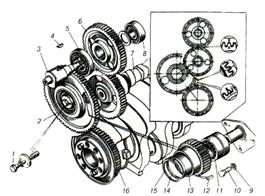 1 — болт кріплення роликового підшипника;2, 13 — проміжні шестерні;3 — вал приводу паливного насоса високого тиску;4 — шпонка;5,8 — кулькові підшипники;6 — шестірня приводу паливного насоса високого тиску;7 — розподільний вал з шестірнею;9 — стопорна шайба;10 — болт кріплення осі;11 — конічний дворядний роликовий підшипник;12 — шпонка;14 — упорне кільце;15 — стопорне кільце;16 — ведуча шестірня колінчастого вала Рис. 1.4 Установка шестерень приводу агрегатів двигуна КамАЗ-740 Протягом четвертого такту поршень знову рухається вгору і витісняє відпрацьовані гази через відкриттів випускний клапан. Потім у циліндр надходить свіжа порція повітря , і робітник цикл повторюється знову. У дизельних двигунах використовуються розділені і нерозділені камери згоряння (відповідно двигуни з передкамерами і з безпосереднім упорскуванням). Двигуни з безпосереднім упорскуванням (DI) є більш ефективними і більш економічними, чим їхні аналоги з передкамерами. Виходячи з цих міркувань, двигуни DІ використовуються в вантажно-пасажирських і вантажних автомобілях. З іншого боку, через більш низький рівень шуму, двигуни з передкамерами встановлюються на легкові автомобілі, де комфорт грає більш важливу роль, ніж у вантажних автомобілів. У добавок до цього, дизельний двигун з передкамерою має більш низький рівень шкідливих викидів у вихлопних газах (НС і NOx) і більш дешевий у виробництві, чим двигун DI. З огляду на зазначені переваги, той факт, що двигун з передкамерою використовує небагато більше палива, ніж двигун DI (на 10-15%), то вважається компромісним рішенням. У порівнянні з двигуном із запаленням від електричної іскри (бензиновим двигуном) обидві версії дизельних двигунів є більш економічними, особливо в діапазоні часткових навантажень.