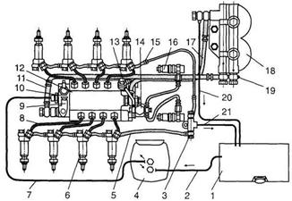 1- впуск, 2- стиснення, 3- робочий хід, 4 – випуск. Рисунок 1.1 - Такти чотирьохтактного дизельного двигуна [ 2 ] Дизельні двигуни зокрема підходять для використання турбо нагнітачів із приводом від вихлопних газів чи механічного надуву. Використання турбо-нагнітача (турбокомпресора) на дизельних двигунах збільшує не тільки віддачу потужності і ККД двигуна, але також зменшує зміст шкідливих домішок у вихлопних газах. Подальший розвиток дизельних двигунів припускає можливість використання їхньої роботи на альтернативному паливі (спирт чи рослинна олія), але тоді може потребувати підстроювання системи упорскування палива. При згорянні дизельного палива утворяться різні речовини. Їхній склад залежить від конструкції двигуна, його потужності і навантаження. Повне згоряння палива приводить до істотного зменшенню концентрації шкідливих речовин. Повне згорання забезпечується точною підтримкою складу паливо-повітряної суміші, абсолютною точністю процесу упорскування й оптимальним завихренням палив-повітряної суміші. Головне утвориться вода (Н2О) і нешкідливий двоокис вуглецю (СО2) і відносно низкою концентрації наступні з'єднання окис вуглецю (СО); незгорілі вуглеводні (НС чи СН) окисли азоту (NOx); окис сірки (SO2) і сірчана кислота (H2SO4), часточки сажі. Коли двигун холодний, то склад вихлопного газу містить у собі неокислені чи окислені лише частково вуглеводні, які видно як білий чи блакитний дим з характерним запахом. Наступні параметри впливають на зменшення витрат палива і скорочення шкідливих викидів: точне встановлення моменту (початку) упорскування; точність при виготовленні форсунок; паливний насос високого тиску (ПНВС) з точним дозуванням палива; модифіковані камери згорянь; точно визначена геометрія смолоскипа (конуса) розпиленого палива і збільшення тиску упорскування. Дизельне паливо складається з великого числа різних вуглеводнів, точка кипіння яких знаходиться в межах приблизно від 180°С 360°С. Паливо виходить за допомогою східчастої перегонки неочищеної нафти. У дизельне паливо додаються різні добавки, що добуваються з важких олій шляхом крекінгу з використанням тепла, тиску і каталітичних добавок. 1.2 Будова та принцип дії У двигуні Камаз-740 застосована система живлення паливом роздільного типу тобто функції паливного насоса високого тиску і форсунки розділені). Вона містить у собі паливні баки, паливний фільтр грубої очищення, паливний фільтр тонкого очищення, паливопідкачуваючий насос низького тиску, насос ручного прокачування палива, паливний насос високого тиску (ПНВТ) із всережимним регулятором і автоматичною муфтою випередження упорскування палива, форсунки, паливопроводи високого і низького тиску і контрольно-вимірювальні прилади. Паливо з паливного бака під дією розрідження, створюваного паливо підкачувальним насосом, через фільтри грубого і тонкого очищення по паливопроводом низького тиску подається до паливного насоса високого тиску. Відповідно до порядкові роботи двигуна (1—5—4—2—6—3—7—8) ПНВТ подає паливо під високим тиском і визначеними порціями через форсунки в камери згоряння циліндрів двигуна. Форсунками паливо розпорошується. Надлишки палива, а разом з ними і повітря, що потрапило в систему, через пропускний клапан ПНВТ і клапан-жиклер фільтра тонкого очищення надходить в паливний бак.