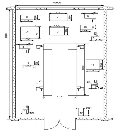 1-ящик для відходів; 2-підйомник; 3-токариний верстат; 4-лещата; 5-стенд для розбирання та випробовування ; 6-устаткування ; 7-дизельний випробовувальний стенд; 8-стіл для ремонту фільтрів, насосів; 9-прилад для діагностування форсунок; 10-стенд для розбирання і збирання паливних насосів; 11-ванна для миття деталей; 12-електросварка; 13-компресор. Рисунок 2.1 – План розміщення обладнання 3. ТО ТА РЕМОНТ Капітальний ремонт спрямований на відновлення частково або повністю витраченого ресурсу автомобіля (агрегату), проводиться на спеціальних АТП і передбачає повне розбирання автомобіля та його агрегатів, ремонт чи заміну всіх несправних агрегатів, вузлів і деталей, втому числі базових, а також складання, регулювання та випробовування. Ресурс автомобіля та його частин після капітального ремонту має становити не менше 80% ресурсу нового автомобіля. Як правило автомобіль підлягає одному капітальному ремонту. Існують такі методи капітального ремонту: - індивідуальний - агрегатний Термін роботи деталей двигунів залежить як від якості їх виготовлення, так і від точного виконання правил технічної експлуатації. При нормальних умовах експлуатації та правильному обслуговуванні дизеля спрацьовування деталей кривошипно-шатунного механізму незначне і його надійна робота забезпечується протягом всього ресурсу дизеля. У випадку порушення правил технічного обслуговування деталі кривошипно-шатунного механізму, які працюють в дуже зменшується, інколи це може призвести до серйозних аварій. спеціалізованих постах. Для забезпечення нормальних умов роботи деталей кривошипно-шатунного механізму забороняється: 1.Повністю завантажувати без попередньої обкатки, згідно з інструкцією з експлуатації, новий двигун або після капітального ремонту. Обкатка двигуна при поступово зростаючих навантаженнях забезпечує наближення тертьових поверхонь до розрахункових геометричних параметрів. 2.Працювати на авто без попереднього прогріву двигуна до температури охолодної рідини не нижче 50 °С. Непрогрітий двигун не забезпечує повної потужності через порушення процесів сумішоутворення і згоряння палива, а також різкого погіршення умов мащення. При цьому прискорюється спрацювання деталей, в першу чергу гільз, поршнів, поршневих кілець, а також відбувається обсмолення цих деталей. 3.Тривалий час працювати з перевантаженням двигуна. 4.Працювати при температурі охолоджувальної рідини нижче 70 °С і вище 95 °С. 5.Допускати тривалу роботу двигуна (понад 15 хв.) при холостому ході, оскільки це супроводжується значним нагароутворенням і пригорянням (заклинюванням у канавках) поршневих кілець. 6. Запускати двигун при температурі повітря нижче -5 °С без попереднього його прогрівання за допомогою підігрівального пристрою або іншими способами. 7.Експлуатувати двигун зі стуками, димними вихлопами, низьким тиском масла (нижче 0,1 МПа) та інтенсивним вигорянням масла. 8.Розбирати кривошипно-шатунний механізм без необхідності. Робити це можна лише у закритому приміщенні і лише у випадку крайньої потреби. Технічний догляд за кривошипно-шатунний механізмом треба виконувати згідно з вимогами інструкції заводу-виготовника. Для запобігання підвищеного спрацьовування деталей кривошипно-шатунного механізму водій зобов'язаний виконувати такі операції: – при щоденному технічному об