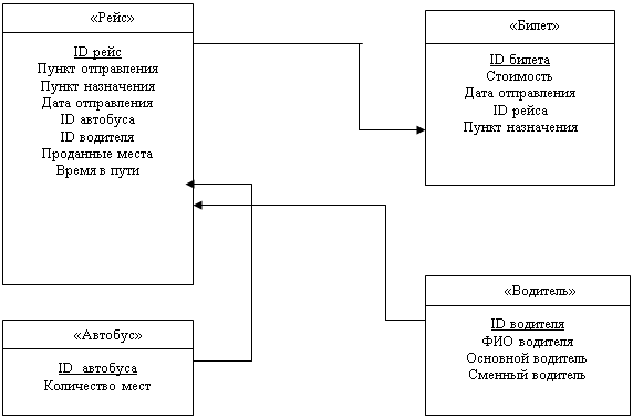 Курсовая работа: Проектирование базы данных "Автовокзал"Курсовая работа: Проектирование базы данных "Автовокзал"Содержание Введение 1. Разработка требования к базе данных 1.1 Постановка задачи 1.2 Анализ информационных потоков, выбор модели 2. Проектная часть 2.1 Проектирование базы данных 2.2 Создание базы данных Заключение Список использованной литературы ВведениеВ современных условиях возрастает значение информационных систем, позволяющих обеспечить информационную поддержку процессов принятия решений. Базы данных являются одним из основных элементов большинства информационных систем. Базой данных является представленная в объективной форме совокупность самостоятельных материалов, систематизированных таким образом, чтобы эти материалы могли быть найдены и обработаны с помощью электронной вычислительной машины. Рассматривая такую предметную область как автостанция, несомненно, невозможно обойтись без структурирования информации в базу данных. База данных обладает, по меньшей мере, тремя важными свойствами (признаками): 1. База данных хранится и обрабатывается в вычислительной системе. Таким образом, любые внекомпьютерные хранилища информации (архивы, библиотеки и т.п.) базами данных не являются. 2. Данные в базе данных хорошо структурированы (систематизированы). Под структурированностью в данном случае понимается явное выделение составных частей (элементов) и связей между ними. 3. Структура базы данных обеспечивает эффективный поиск и обработку данных. Эффективность здесь главным образом определяется тем, как соотносятся гибкость и мощность возможностей (поиска и обработки) с затратами усилий и ресурсов. Актуальность создания приложения базы данных, как части информационной системы, очевидна - хранение в удобном виде, возможность совместного использования базы данных несколькими пользователями, средства поддержания данных в актуальном состоянии, возможность построения отчетов по запросу пользователя. 1. Разработка требования к базе данных В процессе разработки требований к базе данных можно выделить следующие этапы: 1. Постановка задачи. 2. Анализ информационных потоков, выбор модели. 1.1 Постановка задачиВ рамках выполнения курсовой работы требуется разработать базу данных "Автостанция". А. Входные документы. Аl. Расписание рейса А2. Сведения о покупателях В. Выходные документы. B1. Сведения о свободных местах на рейс B2. Сведения о продаже билетов Реквизиты: Номер рейса, Пункт отправления, Пункт назначения, Дата отправления, Номер автобуса, Основной водитель, Сменный водитель, Количество мест, Проданные места на момент отправления, ФИО водителя, Номер водителя, Дата, Время в пути, Регистрационный номер проданного билета, Номер рейса, Дата отправления, Пункт назначения, Стоимость билета. Необходима реализация следующих запросов: выдать информацию о наличии свободного билета на рейс; вывести список рейсов в один и тот же город с указанием времени пути и стоимости билета. 1.2 Анализ информационных потоков, выбор модели На данном этапе требуется логически построить информационную систему, призванную автоматизировать процесс учета данных какой-либо области человеческой деятельности; анализируя информационные потоки, необходимо выбрать модель базы данных. В данной курсовой работе требуется разработать прило