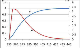 Рисунок 1. График зависимости доли сгоревшего топлива и отвлеченной скорости сгорания от угла поворота коленчатого вала в процессе сгорания