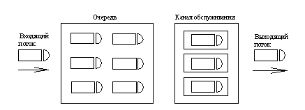 Заданный объём перевозок определяет поток требований на ТО и ремонт. Для нашего случая вероятность нахождения автомобиля в ремонте 19%, а вероятность нахождения автомобиля в ожидании ремонта 13%. Чтобы автомобиль меньше времени ожидал ремонта нужно добиться повышения пропускпой способности поста. Этого можно добиться, используя более производительное оборудование и рациональную организацию процессов ТО и ремонта. Для маркетинговой службы нужно добиться снижения вероятности нахождения автомобиля в ожидании работ. Для моего случая она составляет 14%. Маркетинговой службе нужно искать клиентов, пользующихся услугами предприятия, расширять ассортимент выполняемых услуг и т.п. 3. Системы массового обслуживания Системы, в которых переменными и случайными являются моменты поступления заявок обслуживания и продолжительность самого обслуживания, называются системами массового обслуживания (СМО). Совокупность очереди и каналов обслуживания образуют систему массового обслуживания.