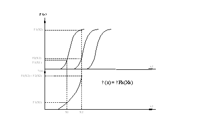 0 < η < 1. В настоящее время для различных агрегатов и видов работ коэффициент η колеблется от 0,3 до 0,8. Сокращение ресурса после ремонта вызывается следующими причинами: 1. Заменой в агрегате только отказавшей детали; 2. Использованием при ремонте запасных частей и материалов иного качества, чем при изготовлении автомобиля, например восстановленных запасных частей; 3. Уровнем организации и технологии ремонта. 1.2 Ведущая функция потока восстановления Ω(x) Ведущая функция потока восстановления определяет общее накопленное количество первых и последующих отказов автомобиля к моменту наработки x или l. Как видно из рисунка 2 из-за вариации наработок на отказ происходит их смещение, а функции F1(x), F2(x), F3(x) частично накладываются друг на друга.