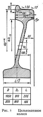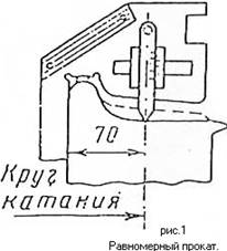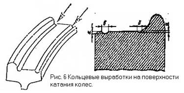 Неисправности колёс. Прокат по поверхности катания колеса образуется вследствие его трения о рельсы (рис.1). Практически принято считать, что 1мм проката обода цельнокатаного колеса возникает в среднем после пробега колёсной парой 30000 км. При большом прокате увеличивается сопротивление движению поезда, кроме того, гребень колеса низко опускается и может касаться болтов рельсовых креплений, ослаблять соединение рельсов и даже срезать их болты, что создаёт угрозу для безопасности движения поездов. Наибольшие допускаемые размеры равномерного проката при периодическом и текущем ремонте вагонов, а так же при их эксплуатации, установленные Инструкцией по освидетельствованию, формированию и ремонту вагонных колёсных пар, приведены в таблице 6. Прокат измеряется