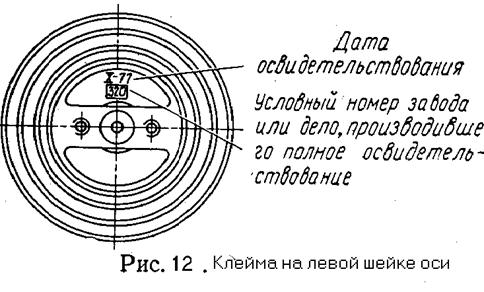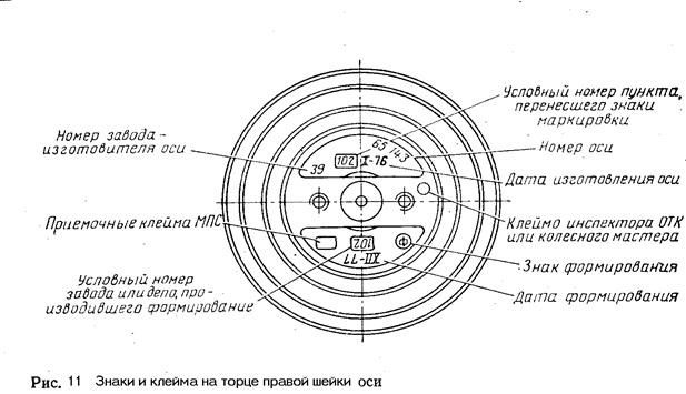 опробование колесной пары на сдвиг на гидравлическом прессе. При формировании колесных пар из новых и старогодных элементов клейма и знаки наносят на торце оси с правой стороны колесной пары (рис.11). Правой стороной колесной пары считается та, на торце оси которой находятся знаки и клейма, относящиеся к изготовлению оси. При полном освидетельствовании знаки и клейма ставят на левом торце оси колесной пары (рис. 12). Нанесение контрольных окружностей и разбивку секторов клеймения колесных пар производят согласно рисунку 11. Окраска колесных пар. Колесная пара после формирования, ремонта или полного освидетельствования окрашивается. Окраске подледлежит: - средняя часть оси и диски колес (краской черного цвета на олифе или лаком); - места соединения ступиц колес с подступичными частями оси с внутренней стороны колесной пары (белилами, плотным слоем по всей окружности полосой шириной 30-40 мм. (в виде угла)); - места соединения лабиринтного кольца с предподступичной частью, а так же предподступичная часть между лабиринтным кольцом и колесом у колесных пар с роликовыми подшипниками после монтажа букс (черной краской или эмалью). Для контроля за положением колеса на оси красной краской в месте соединения ступицы колеса с подступичной частью оси наносится полоса поперек места, окрашенного белилами, размером 30х60 мм. После окраски шейки колесных пар, отправляемых в другие предприятия, покрываются солидолом или техническим вазелином с последующей упаковкой деревянными щитами. Отремонтированный колесные пары подают к колесный парк и устанавливают на соответствующие пути парка готовой продукции или транспортируют в сборочный цех для подкатки под вагоны.
