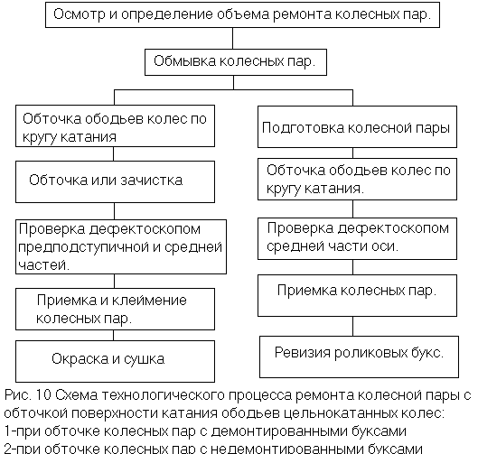 Ремонт колёсных пар со сменой элементов. Этот вид ремонта требует более высокой квалификации работников и сложного оборудования, чем ремонт без смены элементов, так как, кроме колёсно-токарных станков, требуются прессы для выполнения прессовых работ: осеотрезные, осеобдирочные, осетокарные и карусельные станки. Разметка видов ремонта колёсных пар производится обозначениями в местах, указанных в таблице 3. Колёсные пары со сменой элементов ремонтируют и в вагонных колёсных мастерских, колёсных цехах заводов и депо, которые имеют вышеуказанное оборудование. Смена оси производится при её неисправности или маломерности. Колёсная пара, имеющая забракованную ось, исключается из инвентаря, а вместо неё формируется другая колёсная пара с использованием новой оси и старогодных колёс или полностью из старых элементов. Весь процесс смены оси состоит из распрессовки колёсной пары, обработки новой или старогодной оси, упрочняющей накатки, ремонта и проверки ступиц колёс и запрессовки колёс на ось. Смена колёс, имеющих толщину обода менее допускаемой или другие повреждения и неисправности, при наличии которых они подлежат замене, производится в той же последовательности, как и при смене оси. Для замены негодных колёс используются новые и старогодные колёса. Предварительно их тщательно осматривают, проверяют размеры, а затем ступицы колёс растачивают до размера диаметра подступичной части оси с учётом необходимого для запрессовки натяга.