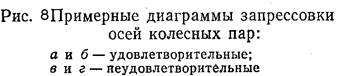 Если при напрессовке колеса на ось будет получена не удовлетворительная диаграмма (рис.8,г) или усилие не будет соответствовать требованиям инструкции, колёсную пару бракуют. Распрессованное колесо разрешается вторично насаживать на тот же конец оси при условии, что на посадочных поверхностях подступичной части оси нет задиров. При этом конечное усилие запрессовки должно быть выше нижнего предела на 15%. На бланке диаграммы, кроме кривой изменения давления, записывают следующие данные: дату запрессовки, тип колёсной пары, номер оси, тип и номер колеса, диаметры подступичной части оси, измеренные с точностью до 0,01мм, конечное давление в тоннах, порядковый номер диаграммы и принятый натяг при запрессовке. Годные и забракованные диаграммы запрессовки и контрольных проверок на сдвиг после оформления и приёмки колёсных пар хранятся 12 лет. Опробование на сдвиг ступиц колёс производится при наличии у колёсной пары признаков ослабления колёс на осях, а так же при поступлении в ремонт на вагоноремонтные заводы, если со дня последнего формирования колёсной пары прошло 12 лет и более. Поступившие колёсные пары для опробования на сдвиг ступиц колёс тщательно осматривают и измеряют элементы для выявления других неисправностей. Затем колёсную пару устанавливают на пресс, строго соблюдая при этом все требования по совмещению геометрических осей элементов и не допуская перекосов. Опробование на прессе производится в направлении распрессовки колёс усилием в пределах 75-85тс с записью результатов на индикаторной диаграмме. Если при опробовании колесо сдвинется, то колёсная пара подлежит расформированию и ремонту. На бланке диаграммы при опробовании ступиц колёс на сдвиг записывают следующие данные: дату опробования, тип колёсной пары, конструкцию колеса, диаметр подступичной части, сторона, которая была опробована, и усилие опробования. Порядок оформления и хранения бланков диаграмм опробования прессовых соединений такой же, как и диаграмм запрессовки. Колёсную пару, выдержавшую испытание, опробуют на сдвиг, вторично осматривают и измеряют. Ремонт колёсной пары без смены элементов.