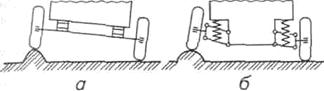де: а - залежна підвіска, б – незалежна підвіска. Рисунок 1.1 - Спрощені схеми підвісок автомобіля. Залежна підвіска (Рисунок 1.1а) забезпечує жорсткий зв’язок між лівим і правим колесом, у результаті чого переміщення одного з них у поперечній площині передається іншому й спричинює нахил кузова. Незалежна (Рисунок 1.1б) підвіска характеризується відсутністю жорсткого зв’язку між колесами одного моста. Кожне колесо підвішено до кузова незалежно від іншого колеса. В результаті при наїзді одним колесом на нерівності дороги коливання його не передаються іншому колесу, зменшується нахил кузова й підвищується в цілому стійкість автомобіля під час руху. Колеса забезпечують безпосередній зв’язок автомобіля з дорогою, беруть участь у створенні й зміні напряму його руху, передають навантаження від ваги автомобіля на дорогу. Залежно від призначення колеса автомобіля поділяють на: ведучі; керовані; комбіновані (ведучі й керовані); підтримувальні. Ведучі колеса перетворюють крутний момент, що передається від трансмісії, на силу тяги, завдяки чому забезпечується поступальний рух автомобіля. Керовані колеса сприймають через підвіску штовхальні зусилля від кузова й за допомогою рульового керування задають напрям руху. Комбіновані колеса виконують функції ведучих і керованих коліс водночас. Підтримувальні колеса створюють опору кочення для задньої частини кузова або рами автомобіля, перетворюючи штовхальні зусилля на кочення коліс. Залежно від конструкції обода та його з’єднання з маточиною всі колеса поділяють на: дискові; без дискові. Дискові колеса встановлюють на всіх легкових автомобілях і більшості вантажних, а без дискові – на великовантажних автомобілях МАЗ та КамАЗ.[3]