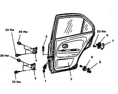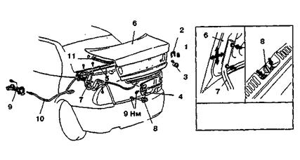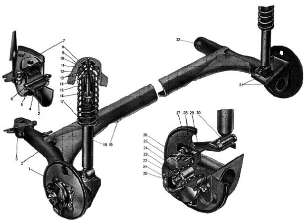 де: 1- Маточина заднього колеса; 2- Важіль задньої підвіски; 3- Кронштейн кріплень важеля підвіски; 4- Гумова втулка шарніра важеля; 5- Розпірна втулка шарніра важеля; 6. Болт кріплення важеля задньої підвіски; 7- Кронштейн кузова; 8- Опорна шайба кріплення штока амортизатора; 9- Верхня опора пружини підвіски; 10- Розпірна втулка; 11- Ізолююча прокладка пружини підвіски; 12. Пружина задньої підвіски; 13- Подушки кріплення штока амортизатора; 14- Буфер ходу стиску; 15- Шток амортизатора; 16- Захисний кожух амортизатора; 17- Нижня опорна чашка пружини підвіски; 18- Амортизатор; 19- З'єднувач важелів; 20- Вісь маточини; 21- Ковпак; 22- Гайка кріплення маточини колеса; 23. Ущільнювальне кільце; 24. Шайба підшипника; 25- Підшипник маточини; 26- Щит гальма; 27- Стопорне кільце; 28- Брудовідображувач; 29- Фланець важеля підвіски; 30- Втулка амортизатора; 31- Кронштейн важеля з вушком для кріплення амортизатора; 32- Резинометалічний шарнір важеля підвіски; Рисунок 1.5 - Задня підвіска MITSUBISHI LANCER 7 кузова приварними болтами з гайками і шайбами. На болт кріплення важеля навертається самоконтрящаяся гайка. До задньої частини важелів приварені кронштейни 31 з вушками для кріплення амортизаторів і фланцями 29 для кріплення болтами осі 20 маточини заднього колеса і щита гальмового механізму заднього колеса. Пружні елементи підвіски складаються з пружин 12 і буфера 14 ходу стиску. Пружина виконана з пружинної сталі круглого перетину. Вона встановлена на амортизаторі 18 і спирається нижньою частиною на чашку 17, а верхньої - в опору 9, приварену до внутрішньої арки кузова. Нижня опорна чашка пружини приварена до амортизатора. Між пружиною і верхньою опорою встановлена ізолююча гумова прокладка 11. Пружини задньої підвіски, як і передньої, під контрольним навантаженням по довжині поділяються на два класи - А и Б. Пружини класу А маркіруються жовтою фарбою по зовнішній стороні середніх витків, класу Б - зеленої. Буфер 14 ходу стиску виконаний з поліуретану. Він установлений на штоку амортизатора усередині пружини підвіски. Зверху буфер упирається в кришку захисного кожуха 16, а при включенні в роботу - на опору буфера, що напресована на верхню частину резервуара амортизатора. На зовнішній поверхні буфера виконані кільцеві канавки, що визначають місце його деформації. Захисний кожух 16 охороняє від забруднення і механічних ушкоджень шток 15 амортизатора і буфер 14 ходу стиску. Кожух виготовлений з гуми, має гофровану форму для зміни довжини при ходах підвіски. У верхній частині кожуха виконана всередини кільцева канавка, у яку заходить відбортована частина сталевої кришки. Нижня частина кожуха, за рахунок своєї пружності, підгортається до опорної чашки пружини підвіски. До фланця важеля підвіски чотирма болтами кріпиться вісь 20 заднього колеса. Одночасно з віссю цими ж болтами кріпиться щит 26 гальмового механізму заднього колеса. На осі на дворядному кульковому підшипнику обертається маточина 1 заднього колеса. Маточина кріпиться на осі гайкою 22 із завзятою шайбою 24. Гайка фіксується на осі обтиском її паска в паз осі. Підшипник 25 у маточині фіксується стопорним кільцем 27. Підшипник закритого типу, із закладною "вічною" змазкою. З внутрішньої сторони маточина ущільнюється двома брудовідображуючими кільцями 28, одне з яких приварене до маточини колеса, інше до фланця осі. Між ними утвориться лабірин