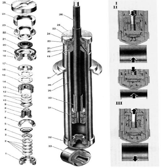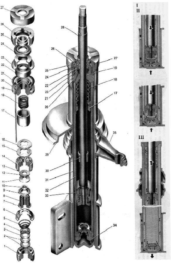де: 1- Корпус клапана стиску; 2- Диски клапана стиску; 3- Дросельний диск клапана стисків; 4- Тарілка клапана стисків;5- Пружина клапана стиску; 6- Обойма клапана стиску; 7- Гайка клапана віддачі; 8- Пружина клапана віддачі; 9- Тарілка клапана віддачі; 10- Шайба гайки; 11- Диск клапана віддачі; 12- Дросельний диск клапана віддачі; 13- Поршень; 14- Кільце поршня; 15- Тарілка пропускного клапана; 16- Пружина пропускного клапана; 17- Плунжер;18- Пружина плунжера; 19- Направляюча втулка штока з фторопластовим шаром; 20- Обойма направляючої втулки штока; 21- Ущільнювальне кільце корпуса стійки; 22- Сальник штока; 23- Обойма сальника; 24- Прокладка захисного кільця штока; 25- Захисне кільце штока; 26- Гайка корпуса стійки; 27- Опора буфера стиску; 28- Шток; 29- Чашка пружини підвіски; 30- Обмежувальна втулка штока; 31- Корпус стійки; 32- Циліндр; 33- Поршень у зборі з клапаном віддачі і пропускним клапаном; 34- Клапан стиску в зборі; 35- Поворотний важіль; І Схема роботи гідравлічної стійки;ІІ Хід стиску; III Хід віддачі. Рисунок 1.4 - Стійка передньої підвіски MITSUBISHI LANCER Поршень ущільнюється в циліндрі кільцем з наповненого фторопласта, за рахунок чого різко збільшується зносостійкість пари: циліндр поршень. На штоку напресована, а потім приварена обмежувальна втулка 30, що, впираючись у плунжер 17 гідравлічного буфера віддачі, обмежує хід віддачі. Гідравлічний буфер віддачі складається з плунжера 17 і пружини 18, під дією якої плунжер опускається вниз до упора у виступ циліндра. Між штоком і плунжером мається зазор, через який повідомляються порожнини над плунжером і під ним. Між верхньою частиною плунжера і циліндром мається калібрований зазор для дроселювання рідини, коли втулка 30 перекриває з торця зазор між штоком і плунжером. Між іншою частиною плунжера і циліндром є значний зазор за рахунок збільшення діаметра циліндра в зоні нижньої і середньої частини плунжера (при нижнім положенні плунжера). Рух штока в циліндрі направляється розрізною втулкою 19 із фторопластовою вставкою. Втулка 19 запресована в напрямну обойму 20. У каналі обойми встановлена зливальна трубка, що з’єднує верхню порожнину обойми з кільцевою проточкою корпуса телескопічної стійки. По цій трубці зливається рідина, що пройшла через зазор між штоком і направляючою втулкою, щоб не було спінювання рідини через контакт з повітрям. Обойма в зборі з направляючою втулкою напресовується циліндричним пояскам на циліндр. Обойма в корпусі стійки ущільнюється гумовим кільцем 21. Слідом за обоймою направляючої втулки в корпусі стійки встановлюються самопідтискний сальник 22 каркасного типу з обоймою 23, прокладка 24 і захисне кільце 25 штока. Всі деталі, встановлені в корпус стійки, піджимаються гайкою 26. При цьому деталі ущільнення вибирають зазори між деталями, забезпечуючи герметичність стійки. Сальник 22 армований металевим каркасом, внаслідок чого досягається необхідна його твердість. Всередині сальника маються два робочі кромки, прилягаючі до поверхні штока. Піджим однієї з кромок забезпечується пружиною, іншої за рахунок пружності гуми сальника. Тому сальник називається самопідтискним. Він встановлений у металевій обоймі 23. Металокерамічне кільце захищає робочу поверхню штока від забруднення. На корпус стійки напресована опора 27, у яку при ході стиску упирається буфер ходу стиску. У верхній частині штока мається різь