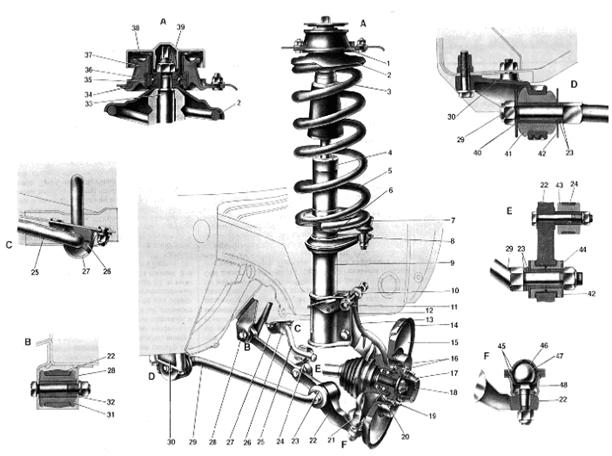 де: 1- Верхня опора телескопічної стійки; 2- Верхня опорна чашка пружини підвіски; 3- Буфер ходу стиску в зборі з захисним кожухом; 4- Опора буфера стиску; 5- Пружина підвіски; 6- Нижня опорна чашка пружини підвіски; 7- Шаровий шарнір кермової тяги; 8- Поворотний важіль; 9- Телескопічна стійка; 10- Ексцентрикова шайба; 11- Регулювальний болт; 12- Кронштейн стійки; 13- Поворотний кулачок; 14- Захисний кожух диска; 15- Диск гальмового механізму; 16- Стопорні кільця; 17- Ковпак маточини; 18- Шліцевий хвостовик корпуса зовнішнього шарніра привода колеса; 19- Направляючий штифт; 20- Підшипник маточини колеса; 21- Шаровий шарнір важеля підвіски; 22- Важіль підвіски; 23- Регулювальні шайби; 24- Стійка стабілізатора поперечної стійкості; 25. Штанга стабілізатора поперечної стійкості; 26- Подушка штанги стабілізатора; 27- Кронштейн кріплення штанги стабілізатора; 28- Кронштейн кузова для кріплення важеля підвіски; 29- Розтяжка важеля підвіски; 30- Кронштейн кріплення розтяжки; 31- Гумова втулка шарніра важеля підвіски; 32- Розпірна втулка шарніра важеля підвіски; 33- Шток стійки; 34- Зовнішній корпус верхньої опори стійки; 35- Внутрішній корпус верхньої опори стійки; 36- Підшипник верхньої опори; 37- Гумовий елемент верхньої опори; 38- Обмежник ходу верхньої опори стійки; 39- Захисний ковпак верхньої опори стійки; 40- Втулка переднього шарніра розтяжки; 41- Подушка переднього шарніра розтяжки; 42- Шайби; 43- Шарнір стійки стабілізатора; 44- Задній шарнір розтяжки; 45- Корпус шарового шарніра; 46- Підшипник шарового шарніра; 47- Шаровий палець; 48- Захисний чохол кульового пальця. Рисунок 1.3 - Передня підвіска MITSUBISHI LANCER 1.2.1 Стійка передньої підвіски Телескопічна гідравлічна стійка (рисунок 1.4) є основним вузлом передньої підвіски. Вона сполучає в собі групу деталей, одні з яких виконують функції направляючого пристрою підвіски, а інші елемента, що гасить. До першої групи деталей відносяться корпус стійки і деталі її кріплення до кузова і поворотного кулачка, до другий гідравлічний амортизатор, вмонтований у стійку. Корпус стійки 31 виготовлений із труби, до нижньої частини якої приварене дно, а у верхній частині нарізане внутрішнє різьблення для гайки 26. Зовні до корпуса стійки приварений: внизу - кронштейн для з'єднання з поворотним кулачком, у середній частині опорна чашка 29 пружини підвіски і поворотний важіль 35, з'єднаний з тягою кермового привода. У щоках кронштейна виконані по два отвори, з них верхні овальні під регулювальний болт. У корпусі стійки встановлений циліндр 32, у нижню частину якого запресований клапан 34 стиску. Його корпус підгорнутий до дна корпуса стійки. Клапан стиску складається з корпуса 1, трьох плоских дисків 2 і 3, тарілки 4, пружини 5 і обойми 6. У центрі корпуса виконане гніздо з фаскою, до якого притискаються пружиною 5 диски клапана і тарілка 4. Іншим кінцем пружина упирається в обойму 6, напресовану на посадковий пасок корпуса клапана. Для проходу рідини з корпуса стійки в циліндр і назад у нижній частині корпуса виконані циліндрична проточка і чотири вертикальних пази. Такі ж пази є й у верхній частині корпуса клапана стиску. Диски 2 клапани стиску плоскі, по центрі мають отвору для проходу рідини. У центральному отворі диска 3 є три вирізи для дроселювання рідини при малій швидкості переміщення штока. Цей диск називається дросельним. У тарілки 4 у нижній центральній частині маєт