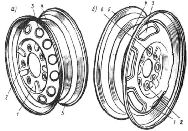 де: а, б) 1 - до обода приварений диск, 2 – отвори для кріплення колеса, 3 – покращують охолодженість, 4 – виямка обода, 5 – обод. Рисунок 1.7 - Обід і диск колеса автомобілів MITSUBISHI LANCER До маточини кріпиться направляючими штифтами гальмівний диск. Штифти центрують відносно маточини колесо, яке кріпиться до неї сферичними болтами. Цими ж болтами додатково кріпиться до маточини гальмівний диск. Маточина заднього колеса встановлена на осі на закритому двухрядному підшипнику, який фіксується в маточині стопорним кільцем. Маточина кріпиться на осі за допомогою гайки, що закривається пластмасовим ковпаком. Вісь маточини колеса разом з гальмівним щитом кріпиться болтами до фланця подовжнього важеля задньої підвіски. До маточини сферичними болтами прикріплюються гальмівний барабан і колесо. Запасне колесо на автомобілі MITSUBISHI LANCER розміщується в багажному відділенні. Воно розташовано там під полом в горизонтальному положенні.[1, 3, 4] 1.3 Схеми