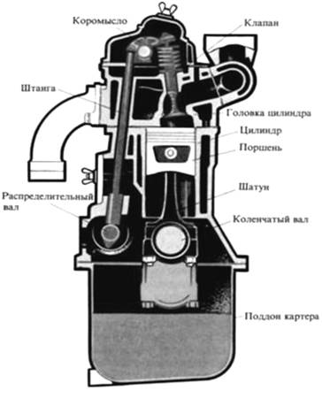 Рисунок 1.1 - Схема На схеме показаны основные части двигателя автомобиля: - распределительный вал, - штанга, - коромысло, - клапан, - головка цилиндра, - цилиндр, - поршень, - шатун, - коленчатый вал, - поддон картера.
