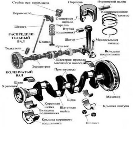 Рисунок 1.2 – Детали кривошипно-шатунного и газораспределительного механизмов Рассмотрим основные части кривошипно-шатунного механизма двигателя и схему их взаимодействия. Кривошипно-шатунный механизм двигателя включает блок цилиндров, головку блока, поршни, поршневые пальцы и кольца, шатуны, коленчатый вал, коренные и шатунные подшипники, маховик и масляный картер (рисунок 1.2). Цилиндр является основной частью двигателя, в которой происходит весь рабочий процесс. Внутренняя часть цилиндра отполирована до зеркального блеска, поэтому ее и называют зеркалом цилиндра. У многоцилиндровых двигателей цилиндры изготовлены в одной общей отливке, образующей блок цилиндров. Сверху блок плотно закрывает головка. В головке цилиндров имеются впускные и выпускные каналы, перекрываемые клапанами, и отверстия для ввертывания свечей зажигания. Через впускные каналы в цилиндры поступает горючая смесь, а через выпускные каналы выходят отработавшие газы. Между блоком и головкой ставят металлоасбестовую уплотняющую прокладку, обеспечивающую герметичность соединения. Блок и головка имеют двойные стенки, образующие полость, которую заполняют охлаждающей жидкостью. Эту полость называют рубашкой охлаждения. Нижнюю часть поршня называют юбкой, верхнюю головкой, а плоскость, которая воспринимает давление газов, — днищем. С внутренней стороны юбка имеет приливы — бобышки с отверстиями для поршневого пальца. Для того чтобы юбка поршня могла постоянно прилегать к зеркалу цилиндра и не заклиниваться при тепловом расширении, на ней имеется разрез, допускающий ее сжатие. Блок цилиндров двигателя легкового автомобиля составляет одно целое с верхней частью картера. Высокая жесткость блока обеспечивается тем, что плоскость разъема картера расположена ниже оси коленчатого вала на 50 мм. Расстояние между осями цилиндров составляет 95 мм; по всей высоте цилиндров сделаны протоки для охлаждающей жидкости, благодаря чему обеспечивается интенсивный отвод тепла, улучшается охлаждение поршней и поршневых колец, несколько снижается температура моторного масла и уменьшается вероятность деформаций блока от неравномерного нагрева. В верхней части цилиндров у некоторых блоков запрессованы короткие сухие гильзы длиной 40 мм со стенками толщиной 15,75 мм. При эксплуатации гильзы не выпрессовываются; растачивание и хонингование цилиндров при ремонтах производится совместно, т.е. так же, как и цилиндров, не имеющих гильз. Водяная рубашка блока цилиндров сообщается с рубашкой головки блока через специальные отверстия в их взаимно прилегающих плоскостях, уплотняемых прокладкой головки блока. В передней части блока имеется полость для цепной передачи, приводящей в движение распределительный вал и дополнительный вал привода масляного насоса, прерывателя-распределителя и бензонасоса. В передней части полости находится окно, закрываемое крышкой привода распределительного вала, для крепления которой передний торец блока снабжен фланцем с девятью резьбовыми отверстиями. Справа на блоке цилиндров расположены приливы с отверстиями для крепления водяного насоса, кронштейна генератора и кронштейна крепления подвески двигателя. С левой же стороны блока имеется развитый прилив, в котором размещен дополнительный вал привода масляного насоса, прерывателя-