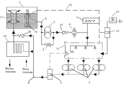 Рисунок 2 Циркуляционная маслосистема с регулированым давлением масла. Схема циркуляционной маслосистемы, рисунок 2 (регулированное давление масла): 1. Маслобак; 2. магистраль всасывающая; 3. нагнетающий маслонасос; 4. Фильтр тонкой очистки; 5. клапан редукционный; 6. датчик замеров давления; 7. Откачивающие маслонасосы; 8. Откачивающая магистраль; 9. Воздухоотделитель центробежный; 10. Теплообменник; 11. Полости (масляные) двигателя; 12. Суфлирующая магистраль. 13. суфлер центробежный; 14. клапан баростатический; 15. Клапан обратный; 16. Заборник масла маятниковый; 17. Воздухоотделитель статический; 18. Клапан перепускной. 1.1.2 Маслосистема с нерегулированным давлением масла Преймушества: величина давления масла зависит от частоты вращения ротора ГТД, она всегда удовлетворяет действительную поребность узлов трения в нем, а запас нагнетаюшего насоса насоса по производительности при этом незначителен. Недостатки: в случае запуска двигателя при низких отрицательных температурах нагнетаемое масло обладает высокой вязкостью и в маслоситеме его давление может достигать величин, при которых в агрегатах и трубопроводах могут возникнуть чрезмерные напряжения. Схема циркуляционной маслосистемы (нерегулированное давление масла):