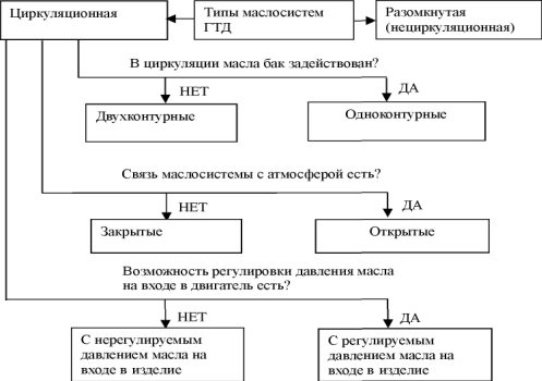 Рисунок 1Класификация типов маслосистем 1.1 Схемы маслосистем Разомкнутая схема-применяются на двигателях с непродолжительной работой(двигателя беспилотных аппаратов, подьемные двигатели, турбокомпрессорные стартеры). В этом случае случае в качестве смазки можно использовать топливо. Вывод : разомкнутые схемы маслосистем не могут приминятся в авиационных двигателях, которые требуют более тщательной смазки и защиты, для поддержания мощьности и продолжительности и высотности полета. Циркуляционная схема –обеспечивает низкие безвозвратные потери масла и длительную непрерывную работу двигателя. Циркуляционные системы подразделяются на одноконтурные в которых циркуляция происходит по схеме «бак- двигатель-бак», и двуконтурные, в которых бак в тои или иной степени исключается из циркуляции масла. Любая из систем будет считатся открытой, если маслобак сообщается с атмосферой либо непосредственно, либо через суфлер двигателя. Сообшение верхней, расположенной над маслом, полости бака с атмосферой через суфлер обуславливается желанием снизить безвозвратные потери масла путем уменьшения его выброса в атмосферу в жидкой фазе. В открытых системах давление масла на входе в нагтетающий насос уменьшается с увеличением высоты полета, и поэтому их высотность относительно мала. Закрытые системы обладают большей высотностью и обеспечивают ускоренный прогрев масла при запуске двигателя. В закрытых системах внутри маслобака создается избыточное по отношению к атмосферному давление. Величина избыточного даввления поддерживается постоянной за счет установленного на маслобаке или трубопроводах масляной системы клапана. В зависимости от величины давления подаваемого в систему нагнетания масла маслосистемы класифицируются на 2 варианта · Регулированное давление масла. · Нерегулированное давление масла. 1.1.1 Маслосистема с регулированным давлением масла Преймушества :Подводит масло к узлам трения в полном обьеме также и в случае аварийных утечек из нее до тех пор, пока суммарная велечина прокачки и аварийных утечек не привысит подачу нагнетаюшего насоса. После этого начнется снижатся давление масла на входе, что привидет к срабатыванию сигнализатора мимального давления. Недостаток : Производительность нагнетаюшего насоса на всех режима работы двигателя, превышает потребную, из-за чего значительную часть масла после выхода из насоса приходится возвращать обратно на вход в него, кроме номинального режима работы двигателя. То есть на малых режимах работы двигателя к трущимся поверхностям подается излишнее количество масла, что ухудшает характеристики маслосистемы.