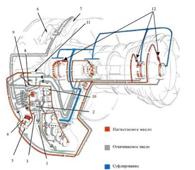 Цель работы – использование системного анализа при исследовании масляной системы газотурбинного двигателя. Объект исследования – масляная система газотурбинного двигателя. 2. Анализ системы 2.1 Составляющие системы 1. Теплообменник Используются для охлаждения масла. Применяются 2 видов теплообменников (далее ТМТ)[1]низкого или высокого давления, в первом случае топливо для охлаждения масла отбирается из топливной магистрали до топливного насоса, во втором за ним. ТМТ высокого давления отличаются компактностью, но, находясь под высоким давлением топлива, они должны обладать высокой прочностью и надежностью. Когда хладоресурс топлива недостаточно, в маслосистеме дополнительно устанавливают ВМТ. Выбор теплообменников для охлаждения масла производится из условий обеспечения заданных температур масла на всех режимах работы ГТД. В зависимости от места расположения теплообменника маслосистемы различают на системы с «горячим» и «холодным» баком. В маслосистеме с «горячим» баком устанавливается в магистрали подвода масла в двигатель, с «холодным» баком в магистрали откачки. В маслосистеме с «горячим» баком благодаря рациональному и конвективному теплообмену масло передает окружающей среде ощутимую часть тепла, снижая тем самым нагрузку на теплообменник, что позволяет уменьшить его размеры. Составляющие: 1. пучки труб - через которые топливо поступает в теплообменник, а горячее масло проходит по межтрубной полости. 2. Перегородка удлиняет путь масла, увеличивает его скорость и эффективность охлаждения. 3 Перепускной клапан который открывается при увеличении перепада давления в масляной полости свыше допустимого (засорение), (при этом часть масла со входа сразу поступает на выход из теплообменника, предохраняя ТМТ от поломки). 4. Датчики температуры – установлен на выходе масла из теплообменника. 2. Маслобак Составляющие:1. Горизонтальная перегородка – отделяющий отсек отрицательных перегрузок от основного объема. При действии отрицательных перегрузок масло удерживается под перегородкой. 2. Заборный патрубок - при действии отрицательных перегрузок остается в масле и смазка двигателя не прекращается. 3. Заливная горловина - для подачи масла в маслобак. 4. Предохранительный фильтр - для задержания посторонних предметов, также установлен на выходе маслобака. 5. Щтуцер – для обеспечения закрытой заправки маслобака авиационного двигателя. 6. Попловковый клапан – для автоматического прекращения закрытой заправки. 7. Предохранительный клапан защищает маслобак от разрушения при повышении давления суфлирования сверх допустимого. 8. Сливной кран предназначен для полного удаления масла; поэтому крепится в нижней части маслобака. 9. Датчик контроля уровня масла в маслобаке. 10. Минимальный уровень масла. 11. Мерная линейка 12. Фланец - для минимального пенообразования масла при его возврате, направляется на стенки маслобака где оно стекает под небольшим углом. 13. Патрубок суфлирования. 14 Фланец – слив масла. Маслобак предназначен для размещения масла. Из маслобака подается в маслосистему и возвращается в него после откачки. 3. Блок маслонасосов Составляющие: 1. шестерни нагнетающей ступени переносит масло заполнившее впадины между зубьями во всасывающую полость переносится в полость нагнетания и выдавливается там при входе зуб