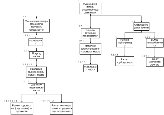 Рисунок 3 Схема циркуляционной маслосистемы с не регулированным давлением масла. 1. Забор масла из маслобака. 2. Блок маслонасосов. 3. клапан предохранительный. 4. фильтр. 5сигнализатор максимального перепада давления на фильтре. 6. ТМТ (топливо масляный теплообменник). 7 Воздухомасляный теплообменник. 8. слив в маслобак. 9 Воздухоотделитель. 10. суфлер центробежный. 11. Датчик перепада давления между ступенями нагнетания и откачивания. 12. фильтр последнего шанса. Выводы: Преимущества маслосистемы с неурегулированным давлением масла по сравнению со схемой с регулируемым давлением масла: 1. Существенно меньший барботаж (перемешивания) масла и, соответственно, меньшее тепловыделение. 2. Более эффективная по сравнению с маслосистемой с регулируемым давлением откачка масла на всех режимах работы двигателя. 3. Лучшие условия смазки узлов трения при низкотемпературном запуске двигателя. 4. Отсутствие редукционного клапана упрощает обслуживание маслосистемы Заключение: для дальнейшего анализа выбираем маслосистему с нерегулированным давлением масла. Применение, которых используется шире по сравнению с другими схемами маслосистем для двигателей последнего поколения. При выборе схемы маслосистемы ГТД рекомендуется отдавать предпочтение замкнутой схеме с нерегулируемым давлением масла на входе в двигатель. Полно поточная схема позволяет спроектировать нагнетающий масляный насос с меньшим запасом по производительности. В целях строгой дозировки прокачки масла его подвод к узлам трения, включая смазку подшипников качения, выполняют через калиброванные струйные форсунки. Насосы, откачивающие масло из опор и агрегатов ГТД, должны в 2, 3 раза превосходить по производительности нагнетающие насосы. 1.2 Дерево проблем, дерево целей Обзор литературы определил основные проблемы при проектировании маслоситемы. Из рассмотренной проблематики представим дерево проблем: