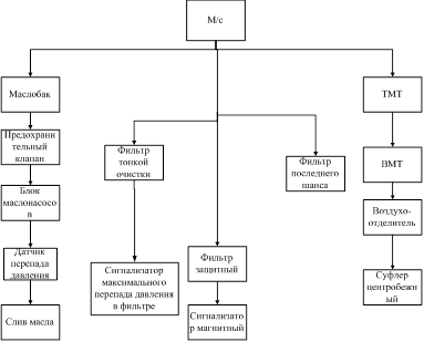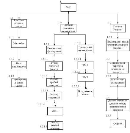 Рисунок 6 Структура системы Эмерджентность С помощью регулирования давления масла и воздуха суфлированием укрепляет и уплотняет полости двигателя тем самым повышая его мощность и уменьшает потери масла и топлива. Целостность Изменение фильтрующего материала в фильтре грубой очистки, изменяет его пропускную способность, что изменяет время запуска двигателя. Изменение длинны перегородок в ТМТ влияет на скорость и охлаждение проходящего масла. Уменьшение: потеря скорости и теплоотводности агрегата изменяет качество масла, следовательно ухудшение работы двигателя. Увеличение: потеря в компактности агрегата что изменяет общие объемы системы. Что является не допустимым в в конструкции самолета. Изоморфизм Сходство объектов по строению или по форме просматривается в разновидностях фильтров, отличающимися только матерьялами которые используются в конструкции. Изофункционализм Просматривается в работе нагнетающей и откачивающей ступени маслонасоса. Ведущая шестерня блока насоса связана с приводным валом который приводит в движение шестерни откачивающей и нагнетающей ступени маслонасоса. Аддитивность Сумму изменений в системе просматривается если просуммировать свойства подсистем фильтрования и охлаждения. Значение суммы является важной в повышении качества масла после циркулировании в узлах смазывания. Также аддитивность в подсистеме охлаждения; суммы ТМТ и ВМТ. ТМТ и ВМТ обеспечивают охлаждение масла. Так как ТМТ не обеспечивает полностью охлаждение масла. Прогрессирующая систематизация: В системе просматривается прогрессирующая систематизация. Это просматривается в работе блока маслонасосов, которые при увеличении давления регулируются датчиком перепада давления. Элементный состав Смешанный. Представлены гомогенные элементы в различных агрегатах обладающие не изоморфизмом, не изофунциональностью. Но также есть и гетерогенные элементы на примере фильтров ФПШ. Тип элементов Энергетический. Блок маслонасосов преобразует энергию приводного вала в движение шестерней. Тип связей Вещественный. Перенос масла между элементам Тип структуры Смешанный: иерархичный, линейный. Количество уровней : 4. Ресурсы Энергия приводного вала. Масло как рабочее тело циркуляции. В системе выявлено 3 подсистемы: 1. Циркулирование масла 2. Фильтрация масла. 2. Охлаждение масла. Подсистемы взаимосвязаны и подчинены выполнению прямых целей (циркулирование, фильтрация, охлаждение) и главной (смазывание, защита трущихся пар, охлаждение двигателя). 2.3 Функциональное описание 1. Маслосистема – Обеспечивает сохранение энергоресурса двигателя, обеспечить работу двигателя на всех режимах двигателя. Контроль летных способностей двигателя на разных режимах полета. 1.1. Система подвода масла - Обеспечивает подвод масла к трущимся парам, смазывая детали двигателя, при трении которых теряется общая мощность двигателя. Данная подсистема сохраняет энергоресурс двигателя. 1.1.1 Маслобак- Обеспечивает хранение масла. Определяет количество масла которое циркулирует в маслосистеме. Определяет напор масла для блока маслонасоса. 1.1.2 Блок маслонасосов – Обеспечивает давление масла. Шестеренчатые насосы компактны, обеспечивают высокую производительность, обладают достаточной всасывающей способностью, просты в производстве и надежны в экс
