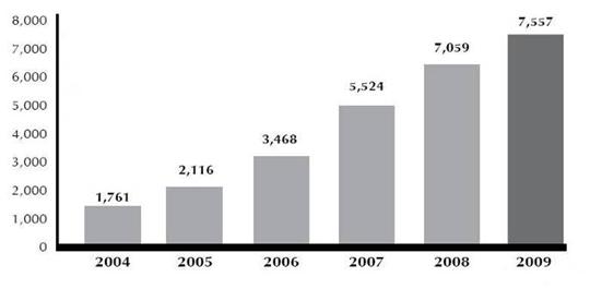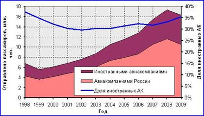 Выявленные отличия рынка услуг от товарного рынка позволяют классифицировать особенности рынка услуг и расширить их перечень за счет выделения такой специфической черты, как зависимость формирования данного рынка от территориального характера расселения населения. К особенностям рынка услуг отнесены: 1) высокая динамичность рыночных процессов. Динамичный характер спроса на услуги подвержен значительному влиянию временного фактора, динамика предложения обусловлена гибкостью отраслевой структуры услуг; 2) территориальная сегментация. Формы предоставления услуг, спрос и условия функционирования предприятий услуг зависят от характеристик территории, охваченной конкретным рынком; 3) локальный характер. Под влиянием территориальных условий, рынок услуг приобретает четкую пространственную форму, в рамках которой формируются отличные от других, но сходные между собой социально-экономические характеристики; 4) высокая чувствительность к изменениям рыночной конъюнктуры. Невозможность хранения, складирования и транспортировки услуг и вместе с тем временное и пространственное совпадение их производства и потребления; 5) высокая скорость оборота капитала. На рынке услуг имеет место более короткий производственный цикл; 6) специфика организации производства услуг. Производителями услуг обычно являются малые и средние предприятия различного профиля, так как эти предприятия обладают большей мобильностью и имеют широкие возможности для чуткого реагирования на изменения рыночной конъюнктуры; 7) специфика процесса оказания услуги. Предполагает личный контакт производителя и потребителя; 8) высокая степень дифференциации услуг. Сложная структура спроса обусловливает появление новых, нестандартных услуг; 9) неопределенность результата деятельности по оказанию услуг. Оценка результата деятельности по оказанию услуги, как правило, возможна только после ее потребления; 10) зависимость от территориального характера расселения населения. Формирование и развитие рынка сферы услуг, в особенности на региональном уровне, во многом связано с характером расселения, сложившимся в территориальных границах конкретного рынка. Осуществленный анализ тенденций развития мирового и российского рынка услуг пассажирских авиаперевозок позволил установить, что спрос на авиаперевозки в мире продолжает устойчиво расти. На представленном ниже графике отражено развитие российского рынка пассажирских авиаперевозок за период с 1998 по 2009 год. Линия «Доля иностранных АК» показывает динамику развития иностранных авиационных предприятий.