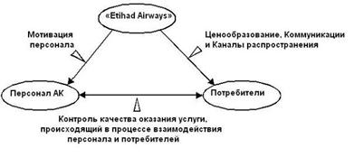 Рис. 4. Треугольная модель маркетинга услуг Ф. Котлера Анализ международных концепций маркетинга услуг позволяет заключить, что, несмотря на то, что они разработаны различными исследователями из различных стран и построены по различным принципам, в целом они имеют общие структурные и концептуальные элементы. Во-первых, все модели отталкиваются от специфики услуги как товара. В той или иной степени эти концепции подчеркивают неосязаемость услуг, неотделимость от источника, несохраняемость и непостоянство качества. Во-вторых, все модели указывают на необходимость внимания к таким стратегическим факторам маркетинга услуг, как персонал, процесс обслуживания и материальное доказательство обслуживания. В-третьих, большинство концепций признают необходимость использования дополнительных стратегий для управления маркетингом услуг. К таким дополнительным стратегиям относятся внутренний маркетинг и интерактивный маркетинг. В то же время необходимо отметить, что при сравнении международных концепций маркетинга услуг можно выделить ряд противоречий. Интересно, что работы по внутреннему маркетингу начали осуществляться в начале 1970-х годов одновременно в Скандинавии и в США. На сегодняшний день существуют два определения внутреннего маркетинга — скандинавский и американский. Так же обстоит дело и со скандинавской и американской моделями качества услуги. Несмотря на эти противоречия, следует признать, что за рубежом в течение последних тридцати лет сформировалось международное сообщество исследователей маркетинга услуг, труды которых, без сомнения, позволяют говорить о самостоятельной дисциплине «маркетинг услуг». Достаточно легко можно выделить главные научные школы, занимающиеся вопросами изучения маркетинга услуг. Такими школами общепризнанно являются Северная школа «Нордик скул», Французская школа и американская школа, представленная Гарвардской школой бизнеса, Центром изучения маркетинга услуг при университете Аризоны и Техасским А&М университетом. Глава 2. Анализ авиакомпании «Etihad Airways» с точки зрения маркетинга услуг 2.1 Характеристика авиакомпании Авиакомпания «Etihad Airways» является официальным государственным авиапредприятием Объединенных Арабских Эмиратов (ОАЭ), и занимается перевозкой пассажиров и груза по всему миру. Основная Цель авиакомпании «Etihad Airways» - создание глобальной авиакомпании 21 века с новым взглядом на концепцию гостеприимства в сфере воздушных перевозок, это говорит о том, компания осуществляет свою цель в отрасли гражданской авиации. Предприятие предоставляет свои услуги пассажирам со всего мира. По данным на май 2010 года «Etihad Airways» выполняет полеты по 61 направлению, а отдел компании, занимающийся грузоперевозками - «Etihad Crystal Cargo», осуществляет полеты в 14 точек (в том числе 6 точек обслуживаемых непосредственно самой «Etihad Airways») в 42 страны Африки, Азии, Европы, Северной Америки и Океании. В приложении на Рисунке 1 показана схема маршрутов в 2009 году. Количество пассажиров также очень велико: в 2008 году количество перевезённых пассажиров превысило 6 миллионов человек, тогда как в 2004 году услугами авиакомпании воспользовалось 340 тысяч человек. На сегодняшний день, флот компании состоит из восьми самолетов Airbus A320-200, двух самолетов Airbus A319, четырнадцати самолетов Airbus A330, одного Airbus A340-300, четыре