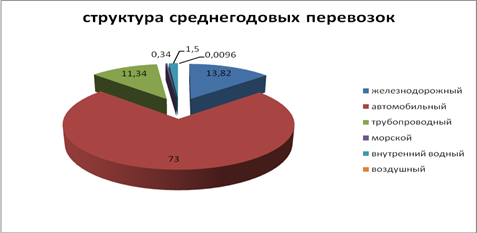 По данным таблицы 2 видно, что наибольший удельный вес по перевозкам груза занимает автомобильный транспорт. В 2006 году его доля была самой большой и составляла 72,77%. Наименьший удельный вес отводится воздушному транспорту – 2008 год – 0,008 %. Среднегодовую структуру грузовых перевозок отражает диаграмма (рис. 1). Данные таблицы 1 можно представить в виде графика, по которому можно проследить динамику грузоперевозок транспорта. Преобладающим видом транспорта по грузоперевозкам является автомобильный транспорт, и число его грузоперевозок растет от 2006 к 2010 году. За ним идет железнодорожный, трубопроводный, внутренний водный и только затем морской и воздушный. На графике видно что, все остальные виды транспорта значительно уступают автомобильному и между собой не превосходят друг друга. Меньше всего перевозок осуществляет воздушный транспорт. Рис.1