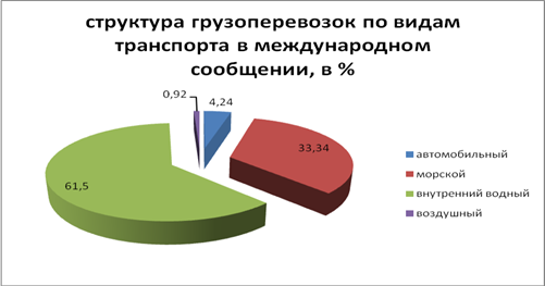 По данным таблицы 7 видно, что наибольший удельный вес в общем количестве грузоперевозок по видам транспорта общего пользования в международном сообщении занимает внутренний водных транспорт. В 2007 году его доля была самой большой и составила 71,27%. Наименьший удельный вес по грузоперевозкам отводится воздушному транспорту, в 2006 году его доля была меньше всех остальных видов транспорта и составляла 0,61%. Среднегодовую структуру перевозок груза по отдельным видам транспорта в международном сообщении отражает диаграмма (рис.2). Рис.2